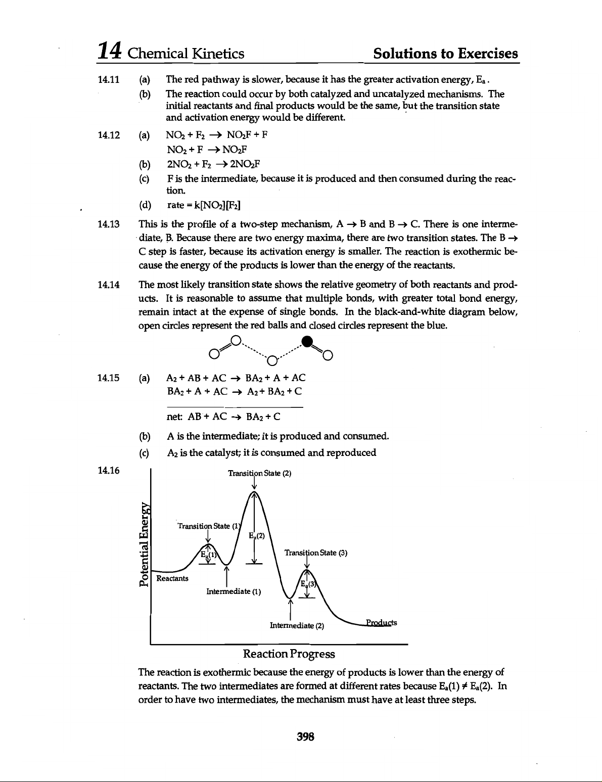 14 Chemical Kinetics Solutions to Exercises 14.11 (a) The red pathway is slower, because it has the greater activation energy, . (b) The reaction could occur by both catalyzed and uncatalyzed mechanisms. The initial reactants and final products would be the same, but the transition state and activation energy would be different. 14.12 (a) + + F + F (b) + (c) F is the intermediate, because it is produced and then consumed during the reac- tion. (d) rate = 14.13 This is the profile of a two-step mechanism, A B and B C. There is one interme- diate, B. Because there are two energy maxima, there are two transition states. The B C step is faster, because its activation energy is smaller. The reaction is exothermic be- cause the energy of the products is lower than the energy of the reactants. 14.14 The most likely transition state shows the relative geometry of both reactants and prod- ucts. It is reasonable to assume that multiple bonds, with greater total bond energy, remain intact at the expense of single bonds. In the black-and-white diagram below, open circles represent the red balls and closed circles represent the blue. 14.15 (a) + AB + AC + A + AC BA₂ + A + AC A₂ + BA₂ + C net: AB + AC BA₂ + C (b) A is the intermediate; it is produced and consumed. (c) A₂ is the catalyst; it is consumed and reproduced 14.16 Transition State (2) Potential Energy Transition State (1) Transition State (3) Reactants Intermediate (1) Intermediate (2) Products Reaction Progress The reaction is exothermic because the energy of products is lower than the energy of reactants. The two intermediates are formed at different rates because Ea(1) # Ea(2). In order to have two intermediates, the mechanism must have at least three steps. 398
