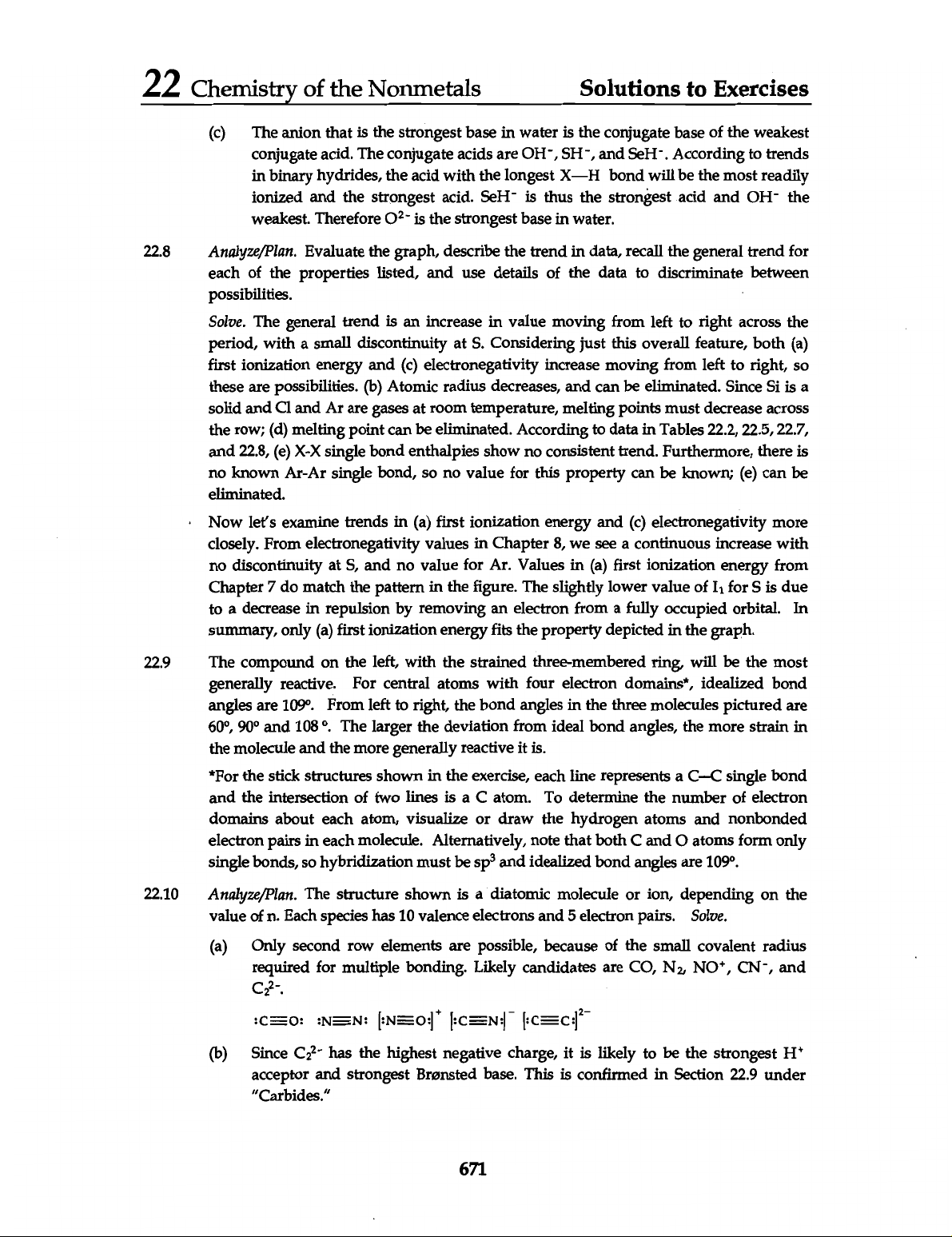 22 Chemistry of the Nonmetals Solutions to Exercises (c) The anion that is the strongest base in water is the conjugate base of the weakest conjugate acid. The conjugate acids are OH-, SH⁻, and According to trends in binary hydrides, the acid with the longest X-H bond will be the most readily ionized and the strongest acid. is thus the strongest acid and OH- the weakest. Therefore is the strongest base in water. 22.8 Analyze/Plan. Evaluate the graph, describe the trend in data, recall the general trend for each of the properties listed, and use details of the data to discriminate between possibilities. Solve. The general trend is an increase in value moving from left to right across the period, with a small discontinuity at S. Considering just this overall feature, both (a) first ionization energy and (c) electronegativity increase moving from left to right, so these are possibilities. (b) Atomic radius decreases, and can be eliminated. Since Si is a solid and Cl and Ar are gases at room temperature, melting points must decrease across the row; (d) melting point can be eliminated. According to data in Tables 22.2, 22.5, 22.7, and 22.8, (e) X-X single bond enthalpies show no consistent trend. Furthermore, there is no known Ar-Ar single bond, so no value for this property can be known; (e) can be eliminated. Now let's examine trends in (a) first ionization energy and (c) electronegativity more closely. From electronegativity values in Chapter 8, we see a continuous increase with no discontinuity at S, and no value for Ar. Values in (a) first ionization energy from Chapter 7 do match the pattern in the figure. The slightly lower value of I₁ for S is due to a decrease in repulsion by removing an electron from a fully occupied orbital. In summary, only (a) first ionization energy fits the property depicted in the graph. 22.9 The compound on the left, with the strained three-membered ring, will be the most generally reactive. For central atoms with four electron domains*, idealized bond angles are 109°. From left to right, the bond angles in the three molecules pictured are 60°, 90° and 108 The larger the deviation from ideal bond angles, the more strain in the molecule and the more generally reactive it is. *For the stick structures shown in the exercise, each line represents a C-C single bond and the intersection of two lines is a C atom. To determine the number of electron domains about each atom, visualize or draw the hydrogen atoms and nonbonded electron pairs in each molecule. Alternatively, note that both C and atoms form only single bonds, so hybridization must be sp³ and idealized bond angles are 109°. 22.10 Analyze/Plan. The structure shown is a diatomic molecule or ion, depending on the value of n. Each species has 10 valence electrons and 5 electron pairs. Solve. (a) Only second row elements are possible, because of the small covalent radius required for multiple bonding. Likely candidates are CO, N₂, NO+, and :NEN: (b) Since has the highest negative charge, it is likely to be the strongest acceptor and strongest Bronsted base. This is confirmed in Section 22.9 under "Carbides." 671