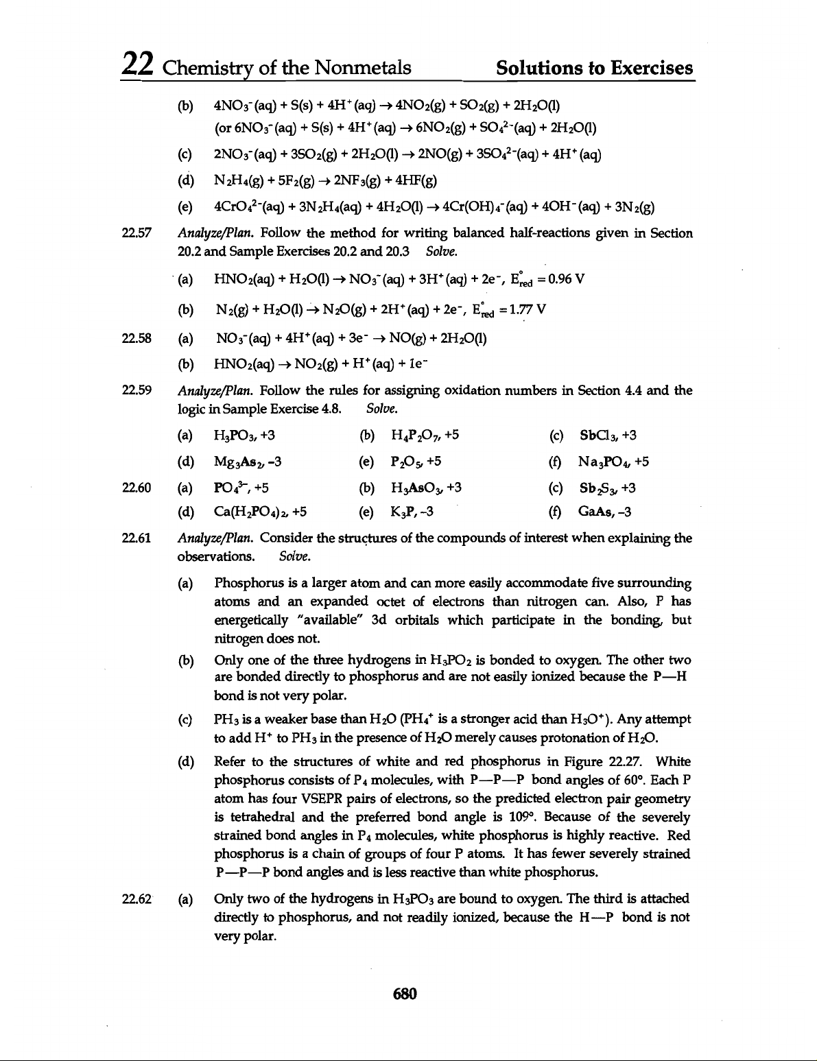22 Chemistry of the Nonmetals Solutions to Exercises (b) (aq) + S(s) + (aq) + + (or (aq) + S(s) + (aq) + + (c) + + 2NO(g) + + (aq) (d) N₂H₄(g) + 2NF₃(g) + 4HF(g) (e) + 3N₂H₄(aq) + + + 22.57 Analyze/Plan. Follow the method for writing balanced half-reactions given in Section 20.2 and Sample Exercises 20.2 and 20.3 Solve. (a) + (aq) + (aq) + 2e⁻, = 0.96 V (b) + + (aq) + 2e⁻, = 1.77 V 22.58 (a) + 4H+ + NO(g) + (b) NO₂(g) + (aq) + 22.59 Analyze/Plan. Follow the rules for assigning oxidation numbers in Section 4.4 and the logic in Sample Exercise 4.8. Solve. (a) +3 (b) H4P2O7, +5 (c) SbCl₃, +3 (d) (e) +5 (f) +5 22.60 (a) +5 (b) +3 (c) (d) Ca(H₂PO₄)₂,+5 (e) -3 (f) GaAs, -3 22.61 Analyze/Plan. Consider the structures of the compounds of interest when explaining the observations. Solve. (a) Phosphorus is a larger atom and can more easily accommodate five surrounding atoms and an expanded octet of electrons than nitrogen can. Also, P has energetically "available" 3d orbitals which participate in the bonding, but nitrogen does not. (b) Only one of the three hydrogens in is bonded to oxygen. The other two are bonded directly to phosphorus and are not easily ionized because the P-H bond is not very polar. (c) PH₃ is a weaker base than H2O (PH₄⁺ is a stronger acid than Any attempt to add to PH₃ in the presence of merely causes protonation of (d) Refer to the structures of white and red phosphorus in Figure 22.27. White phosphorus consists of molecules, with P-P-P bond angles of 60°. Each P atom has four VSEPR pairs of electrons, so the predicted electron pair geometry is tetrahedral and the preferred bond angle is 109°. Because of the severely strained bond angles in molecules, white phosphorus is highly reactive. Red phosphorus is a chain of groups of four P atoms. It has fewer severely strained P-P-P bond angles and is less reactive than white phosphorus. 22.62 (a) Only two of the hydrogens in are bound to oxygen. The third is attached directly to phosphorus, and not readily ionized, because the H-P bond is not very polar. 680