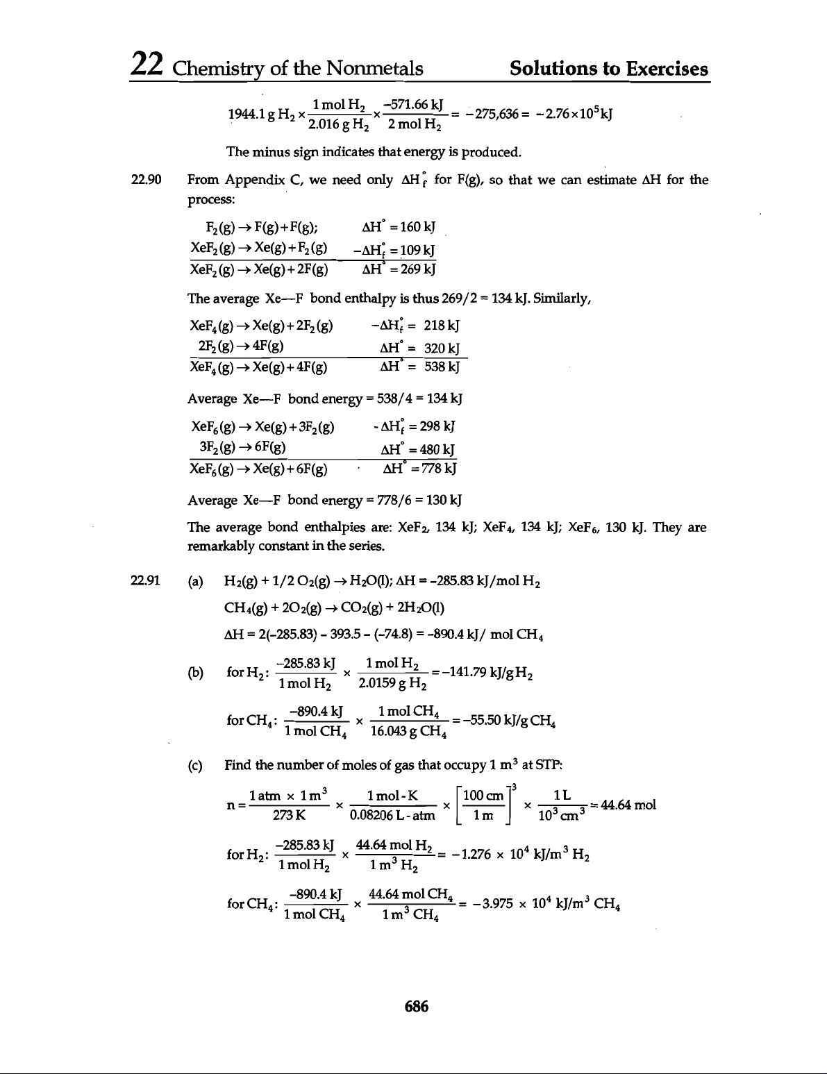 22 Chemistry of the Nonmetals Solutions to Exercises 1944.1 -571.66 = 275,636 = 2.76 The minus sign indicates that energy is produced. 22.90 From Appendix C, we need only for F(g), so that we can estimate AH for the process: F₂(g) F(g)+F(g); = 160 kJ XeF₂(g) The average Xe-F bond enthalpy is thus 269/2 = 134 kJ. Similarly, XeF₄(g) = 218 kJ 2F₂(g) 4F(g) = 320 kJ XeF₄(g) = 538 kJ Average Xe-F bond energy = 538/4 = 134 kJ XeF₆(g) - = 298 kJ 3F₂(g) 6F(g) = 480 kJ XeF₆(g) Xe(g)+6F(g) = 778 kJ Average Xe-F bond energy = 778/6 = 130 kJ The average bond enthalpies are: 134 kJ; 134 kJ; XeF₆, 130 kJ. They are remarkably constant in the series. 22.91 (a) AH = -285.83 kJ/mol H₂ + AH = 2(-285.83) - 393.5 (-74.8) = -890.4 mol CH₄ (b) for H₂: -285.83 1 mol H₂ 1 mol H₂ H₂ = -141.79 kJ/g H₂ for CH₄: 1 -890.4 mol CH₄ mol CH₄ CH₄ = -55.50 CH₄ (c) Find the number of moles of gas that occupy 1 at STP: n = 273 K atm 100 1m 73 1L = 44.64 mol for -285.83 1 mol H₂ 44.64 1 m³ mol H₂ H₂ = -1.276 10⁴ kJ/m³ H₂ for CH₄: 1 -890.4 mol CH₄ 44.64 1 m³ mol CH₄ CH₄ = -3.975 10⁴ kJ/m³ CH₄ 686