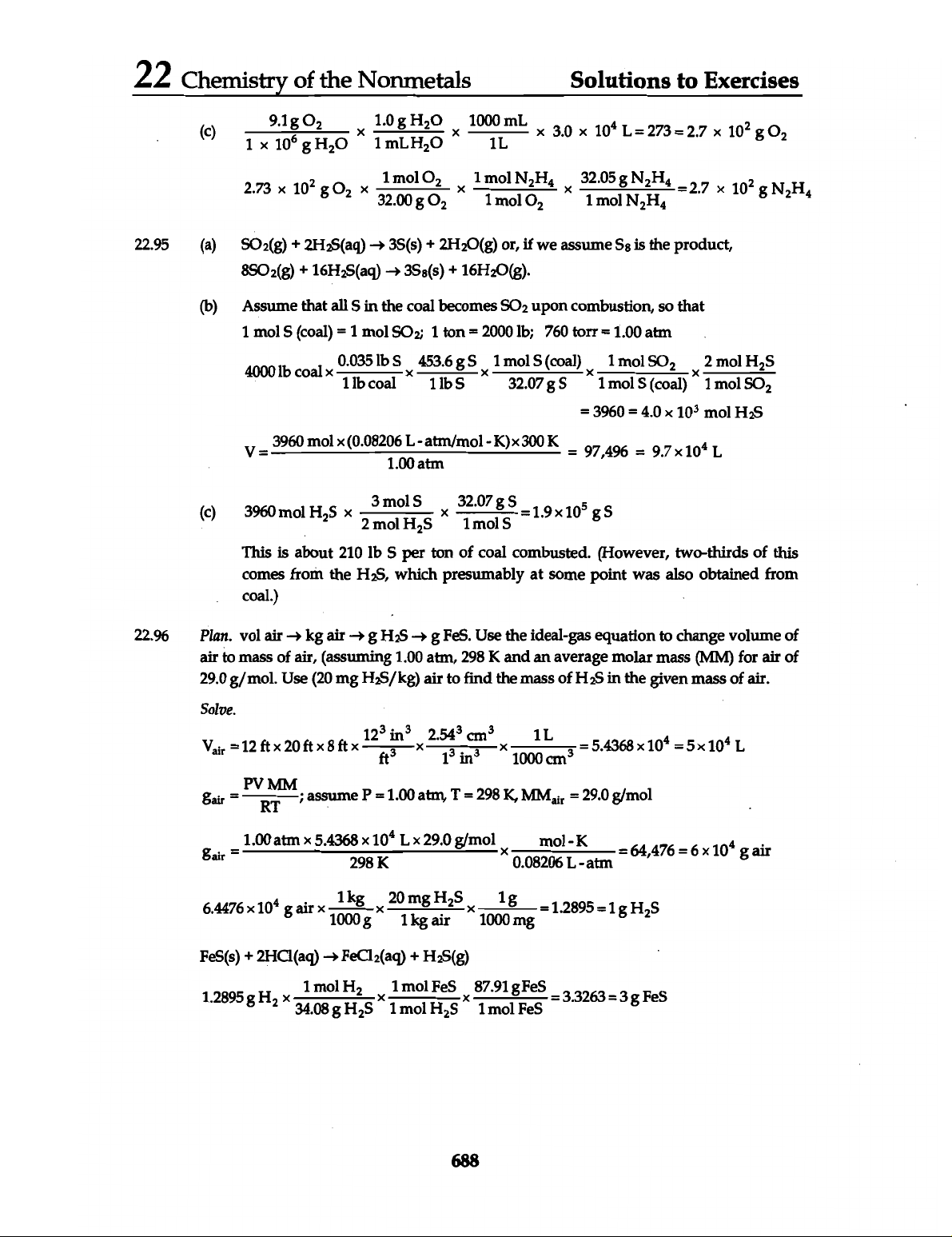 22 Chemistry of the Nonmetals Solutions to Exercises (c) 1 X 9.1 10⁶ g g O₂ H₂O 1 1.0 g H₂O X 1000 1L mL 3.0 X 10⁴ L = 273 = 2.7 X 10² g O₂ 2.73 10² g O₂ X 32.00 1 mol g O₂ O₂ 1 mol 1 mol O₂ 32.05 1 mol = 2.7 10² g 22.95 (a) + 2H₂S(aq) 3S(s) + 2H₂O(g) or, if we assume S₈ is the product, + 16H₂S(aq) 3S₈(s) + 16H₂O(g). (b) Assume that all S in the coal becomes SO₂ upon combustion, so that 1 mol S (coal) = 1 mol SO₂; 1 ton = 2000 lb; 760 torr = 1.00 atm 4000 lb coal 0.035 lb S X 453.6 g 1 mol S (coal) 1 mol 2 mol H₂S 1 lb coal 1lbS 1 mol S (coal) 1 mol SO₂ = 3960 = 4.0 10³ mol V = 3960 mol X (0.08206 - atm/mol - K) 300 K = 97,496 = 9.7 10⁴ L 1.00 atm (c) 3960 mol H₂S 2 3 mol mol H₂S X 1 mol S = 1.9 X 10⁵ gS This is about 210 lb S per ton of coal combusted. (However, two-thirds of this comes from the H₂S, which presumably at some point was also obtained from coal.) 22.96 Plan. vol air kg air g g FeS. Use the ideal-gas equation to change volume of air to mass of air, (assuming 1.00 atm, 298 K and an average molar mass (MM) for air of 29.0 g/mol. Use (20 mg H₂S/kg) air to find the mass of in the given mass of air. Solve. = 12 ft 20 ft 8 ft 12³ X 2.54³ 1³ in³ cm³ X 1000 1L 3 = 5.4368 10⁴ = 5x 10⁴ L PV MM gair = ; assume P = 1.00 atm, T = 298 K, MMair = 29.0 g/mol RT = 1.00 atm 5.4368 X 10⁴ L 29.0 g/mol mol- K = 64,476 = 6 10⁴ g air 298 K 0.08206 L - atm 6.4476 10⁴ g air 1000 1kg 20 1 mg kg air H₂S 1000 mg = 1.2895 = 1 FeS(s) + 2HCl(aq) 1.2895 g H₂ 34.08 1 mol g H₂ H₂S 1 1 mol mol H₂S FeS 87.91 1 mol FeS = 3.3263 = 3 FeS 688