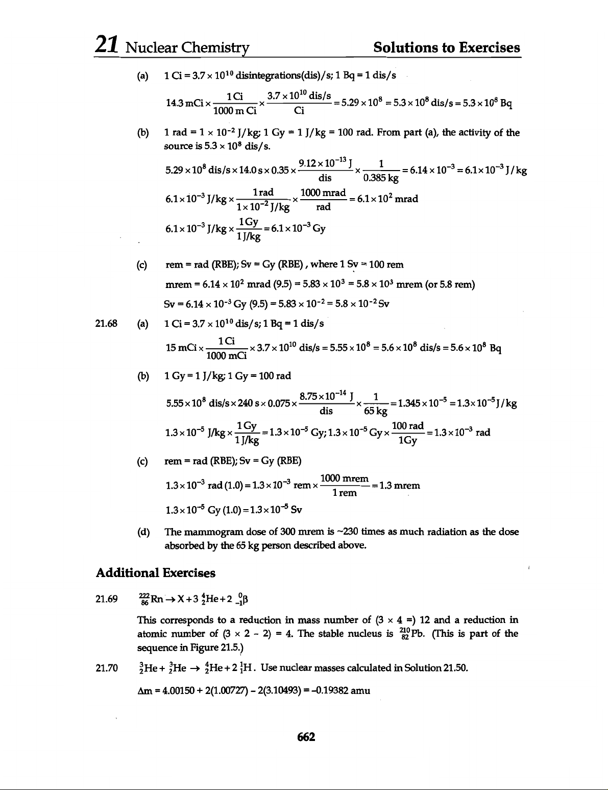 21 Nuclear Chemistry Solutions to Exercises (a) 1 Ci = 3.7 X 10¹⁰ disintegrations 1 Bq = 1 dis/s 14.3 mCi 1000 m 10¹⁰ Ci dis/s = 5.29 10⁸ = 5.3 10⁸ dis/s = Bq (b) 1 rad = 1 X J/kg; 1 Gy = 1 J/kg = 100 rad. From part (a), the activity of the source is 5.3 dis/s. 5.29 10⁸ dis/s dis X 1 = 6.1 X 10⁻³ rad X 1000 rad mrad (c) rem = rad (RBE); Sv = Gy (RBE) where 1 Sv = 100 rem mrem = 6.14 10² mrad (9.5) = 5.83 X 10³ = 5.8 10³ mrem (or 5.8 rem) 21.68 (a) 15 mCi 1000 mCi 1Ci 10¹⁰ dis/s = 5.55 = 5.6 10⁸ dis/s = 5.6 10⁸ Bq (b) 5.55x10° dis/sx 240 sx0.075x dis 65 1 = = 1.3x10⁻⁵ J/kg 1Gy Gy 100 1Gy rad = 1.3 10⁻³ rad (c) 1.3x10⁻³ rad (1.0) = rem 1000 mrem = 1.3 mrem 1 rem 1.3x10⁻⁵ Gy (1.0) = 1.3 X Sv (d) The mammogram dose of 300 mrem is ~230 times as much radiation as the dose absorbed by the 65 kg person described above. Additional Exercises 21.69 This corresponds to a reduction in mass number of (3 4 =) 12 and a reduction in atomic number of (3 2 - 2) = 4. The stable nucleus is (This is part of the sequence in Figure 21.5.) 21.70 Use nuclear masses calculated in Solution 21.50. Am = 4.00150 + 2(1.00727) 2(3.10493) = -0.19382 amu 662