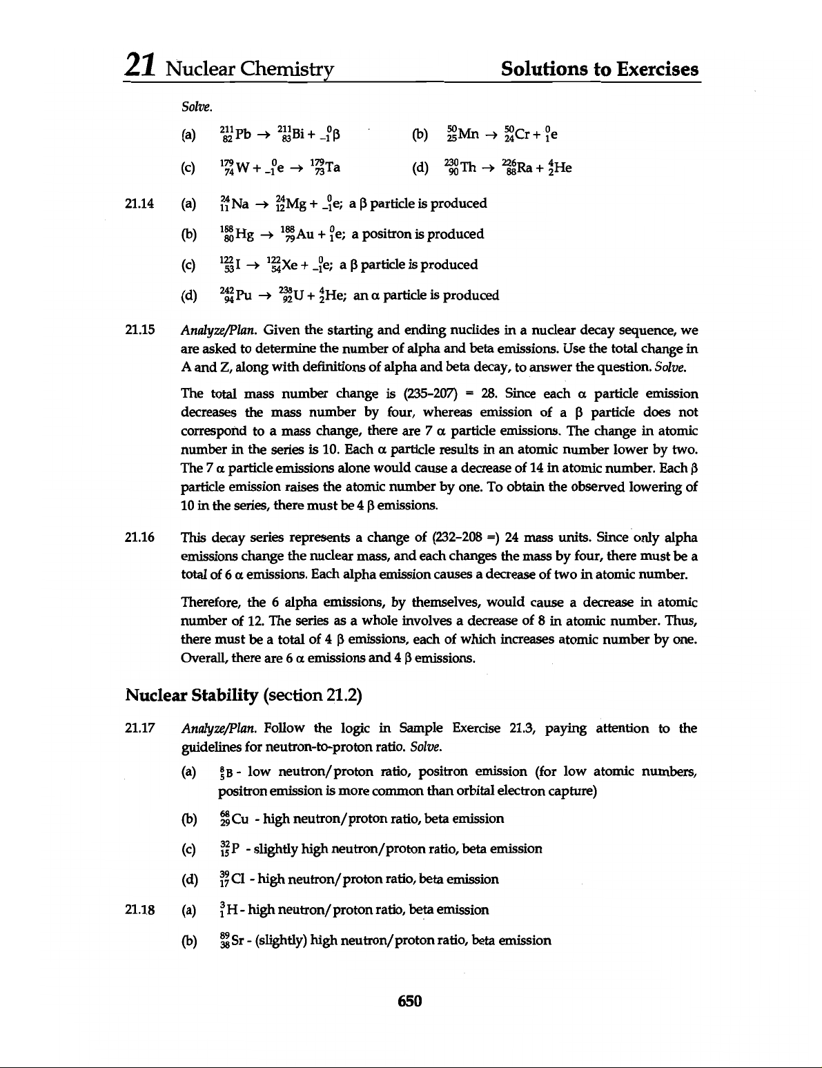 21 Nuclear Chemistry Solutions to Exercises Solve. (a) Pb (b) 50 + 25 Mn (c) (d) 21.14 (a) Na + a particle is produced (b) 188 79 Au + a positron is produced (c) + a particle is produced (d) 238 92 + an α particle is produced 21.15 Analyze/Plan. Given the starting and ending nuclides in a nuclear decay sequence, we are asked to determine the number of alpha and beta emissions. Use the total change in A and Z, along with definitions of alpha and beta decay, to answer the question. Solve. The total mass number change is (235-207) = 28. Since each α particle emission decreases the mass number by four, whereas emission of a particle does not correspond to a mass change, there are 7 α particle emissions. The change in atomic number in the series is 10. Each α particle results in an atomic number lower by two. The 7 α particle emissions alone would cause a decrease of 14 in atomic number. Each particle emission raises the atomic number by one. To obtain the observed lowering of 10 in the series, there must be 4 ß emissions. 21.16 This decay series represents a change of (232-208 =) 24 mass units. Since only alpha emissions change the nuclear mass, and each changes the mass by four, there must be a total of 6 α emissions. Each alpha emission causes a decrease of two in atomic number. Therefore, the 6 alpha emissions, by themselves, would cause a decrease in atomic number of 12. The series as a whole involves a decrease of 8 in atomic number. Thus, there must be a total of 4 emissions, each of which increases atomic number by one. Overall, there are 6 α emissions and 4 emissions. Nuclear Stability (section 21.2) 21.17 Analyze/Plan. Follow the logic in Sample Exercise 21.3, paying attention to the guidelines for neutron-to-proton ratio. Solve. (a) - low neutron/proton ratio, positron emission (for low atomic numbers, positron emission is more common than orbital electron capture) (b) 68 29 Cu - high neutron/proton ratio, beta emission (c) P - slightly high neutron/proton ratio, beta emission (d) 39 17 - high neutron/proton ratio, beta emission 21.18 (a) 1 3 - high neutron/proton ratio, beta emission (b) 89 38 Sr - (slightly) high neutron/proton ratio, beta emission 650