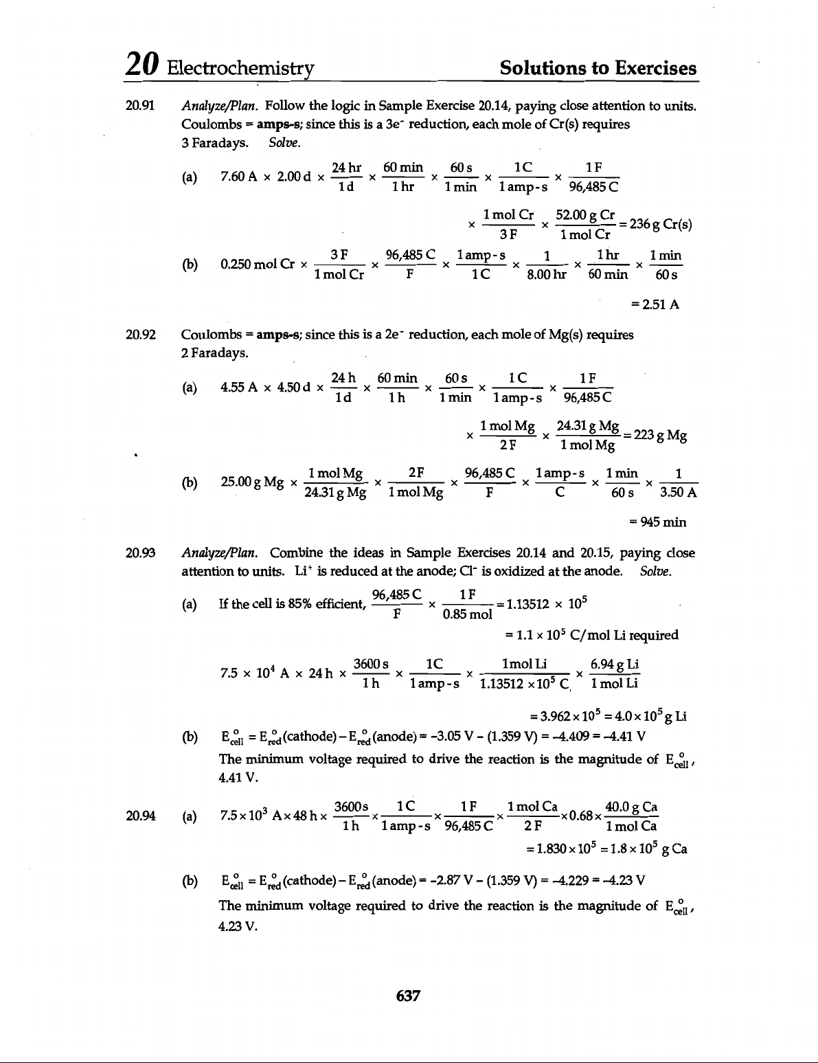 20 Electrochemistry Solutions to Exercises 20.91 Analyze/Plan. Follow the logic in Sample Exercise 20.14, paying close attention to units. Coulombs = amps-s; since this is a reduction, each mole of Cr(s) requires 3 Faradays. Solve. (a) 7.60 A 2.00 d X 24 1d hr X 60 min X 1 60 min S X 1 amp-s 1C X 96,485 1F C X 1 mol Cr 52.00 1 mol g Cr Cr = 236 g Cr(s) 3F (b) 0.250 mol Cr 1 mol 3F Cr X 96,485 F C 1 amp-s 1C 8.00 1 hr 60 1hr min 1 60 min = 2.51 A 20.92 Coulombs = amps-s; since this is a 2e⁻ reduction, each mole of Mg(s) requires 2 Faradays. (a) 4.55 A 4.50 d 24 1d h 60 1h min 1 60 min amp- 1C 96,485 C 1F 1 mol 2F Mg 1 mol Mg Mg = 223 g Mg (b) 25.00 g Mg 24.31 1 mol g Mg Mg 1 mol 2F Mg 96,485 F C 1 amp- C 1 60 min 3.50 1 A = 945 min 20.93 Analyze/Plan. Combine the ideas in Sample Exercises 20.14 and 20.15, paying close attention to units. Li+ is reduced at the anode; Cl⁻ is oxidized at the anode. Solve. (a) If the cell is 85% efficient, F 0.85 = 1.13512 10⁵ = 1.1 10⁵ C/mol Li required 7.5 X 10⁴ A 24 3600 1h 1amp-s 1C 1.13512 1mol Li 10⁵ C, 6.94 1 mol Li Li = 3.962 10⁵ = 4.0 10⁵ g Li (b) = (cathode) (anode) = -3.05 V (1.359 V) = -4.409 = -4.41 V The minimum voltage required to drive the reaction is the magnitude of 4.41 V. 20.94 (a) 7.5 X 10³ A 48 h 3600s 1h 1amp-s 1C 96,485 C 1 mol 2F Ca x0.68 40.0 1 mol Ca Ca = 1.830 = 1.8 10⁵ g Ca (b) = (cathode)- (anode) = -2.87 (1.359 V) = -4.229 = -4.23 V The minimum voltage required to drive the reaction is the magnitude of 4.23 V. 637