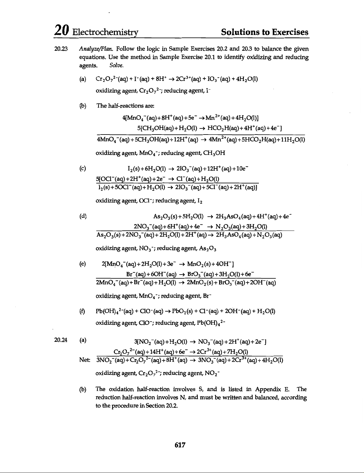 20 Electrochemistry Solutions to Exercises 20.23 Analyze/Plan. Follow the logic in Sample Exercises 20.2 and 20.3 to balance the given equations. Use the method in Sample Exercise 20.1 to identify oxidizing and reducing agents. Solve. (a) oxidizing agent, reducing agent, I⁻ (b) The half-reactions are: oxidizing agent, MnO₄⁻; reducing agent, (c) oxidizing agent, reducing agent, I₂ (d) oxidizing agent, NO₃⁻; reducing agent, (e) oxidizing agent, reducing agent, Br- (f) + oxidizing agent, ClO⁻; reducing agent, 20.24 (a) Net: oxidizing agent, reducing agent, (b) The oxidation half-reaction involves S, and is listed in Appendix E. The reduction half-reaction involves N, and must be written and balanced, according to the procedure in Section 20.2. 617