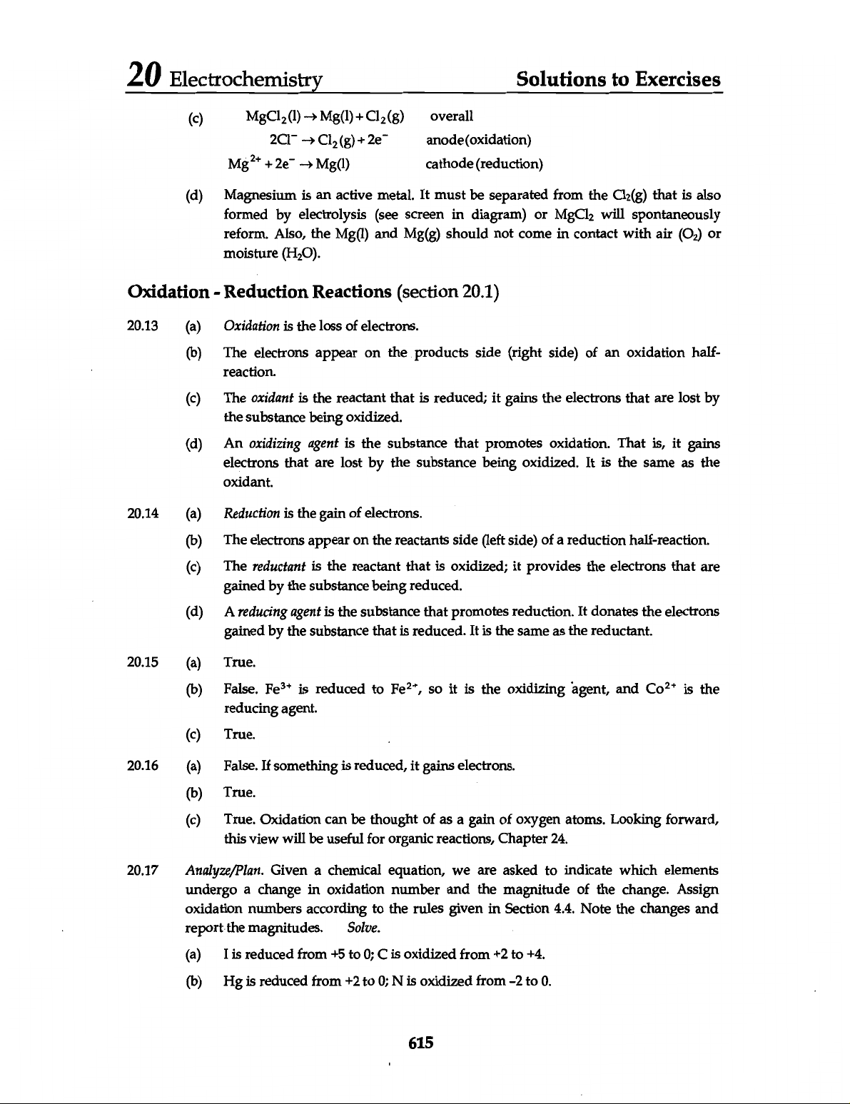 20 Electrochemistry Solutions to Exercises (c) overall 2CI⁻ anode(oxidation) Mg²⁺ + 2e⁻ cathode (reduction) (d) Magnesium is an active metal. It must be separated from the Cl₂(g) that is also formed by electrolysis (see screen in diagram) or MgCl₂ will spontaneously reform. Also, the and Mg(g) should not come in contact with air (O₂) or moisture (H₂O). Oxidation - Reduction Reactions (section 20.1) 20.13 (a) Oxidation is the loss of electrons. (b) The electrons appear on the products side (right side) of an oxidation half- reaction. (c) The oxidant is the reactant that is reduced; it gains the electrons that are lost by the substance being oxidized. (d) An oxidizing agent is the substance that promotes oxidation. That is, it gains electrons that are lost by the substance being oxidized. It is the same as the oxidant. 20.14 (a) Reduction is the gain of electrons. (b) The electrons appear on the reactants side (left side) of a reduction half-reaction. (c) The reductant is the reactant that is oxidized; it provides the electrons that are gained by the substance being reduced. (d) A reducing agent is the substance that promotes reduction. It donates the electrons gained by the substance that is reduced. It is the same as the reductant. 20.15 (a) True. (b) False. Fe³⁺ is reduced to Fe²⁺, so it is the oxidizing agent, and is the reducing agent. (c) True. 20.16 (a) False. If something is reduced, it gains electrons. (b) True. (c) True. Oxidation can be thought of as a gain of oxygen atoms. Looking forward, this view will be useful for organic reactions, Chapter 24. 20.17 Analyze/Plan. Given a chemical equation, we are asked to indicate which elements undergo a change in oxidation number and the magnitude of the change. Assign oxidation numbers according to the rules given in Section 4.4. Note the changes and report the magnitudes. Solve. (a) I is reduced from +5 to 0; is oxidized from +2 to +4. (b) Hg is reduced from +2 to 0; N is oxidized from -2 to 0. 615