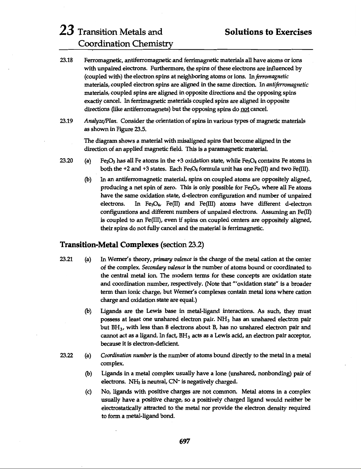 23 Transition Metals and Solutions to Exercises Coordination Chemistry 23.18 Ferromagnetic, antiferromagnetic and ferrimagnetic materials all have atoms or ions with unpaired electrons. Furthermore, the spins of these electrons are influenced by (coupled with) the electron spins at neighboring atoms or ions. In ferromagnetic materials, coupled electron spins are aligned in the same direction. In antiferromagnetic materials, coupled spins are aligned in opposite directions and the opposing spins exactly cancel. In ferrimagnetic materials coupled spins are aligned in opposite directions (like antiferromagnets) but the opposing spins do not cancel. 23.19 Analyze/Plan. Consider the orientation of spins in various types of magnetic materials as shown in Figure 23.5. The diagram shows a material with misaligned spins that become aligned in the direction of an applied magnetic field. This is a paramagnetic material. 23.20 (a) has all Fe atoms in the +3 oxidation state, while contains Fe atoms in both the +2 and +3 states. Each Fe₃O₄ formula unit has one Fe(II) and two Fe(III). (b) In an antiferromagnetic material, spins on coupled atoms are oppositely aligned, producing a net spin of zero. This is only possible for where all Fe atoms have the same oxidation state, d-electron configuration and number of unpaired electrons. In Fe(II) and Fe(III) atoms have different d-electron configurations and different numbers of unpaired electrons. Assuming an Fe(II) is coupled to an Fe(III), even if spins on coupled centers are oppositely aligned, their spins do not fully cancel and the material is ferrimagnetic. Transition-Metal Complexes (section 23.2) 23.21 (a) In Werner's theory, primary valence is the charge of the metal cation at the center of the complex. Secondary valence is the number of atoms bound or coordinated to the central metal ion. The modern terms for these concepts are oxidation state and coordination number, respectively. (Note that "oxidation state" is a broader term than ionic charge, but Werner's complexes contain metal ions where cation charge and oxidation state are equal.) (b) Ligands are the Lewis base in metal-ligand interactions. As such, they must possess at least one unshared electron pair. NH₃ has an unshared electron pair but BH₃, with less than 8 electrons about B, has no unshared electron pair and cannot act as a ligand. In fact, BH₃ acts as a Lewis acid, an electron pair acceptor, because it is electron-deficient. 23.22 (a) Coordination number is the number of atoms bound directly to the metal in a metal complex. (b) Ligands in a metal complex usually have a lone (unshared, nonbonding) pair of electrons. is neutral, CN- is negatively charged. (c) No, ligands with positive charges are not common. Metal atoms in a complex usually have a positive charge, so a positively charged ligand would neither be electrostatically attracted to the metal nor provide the electron density required to form a metal-ligand bond. 697