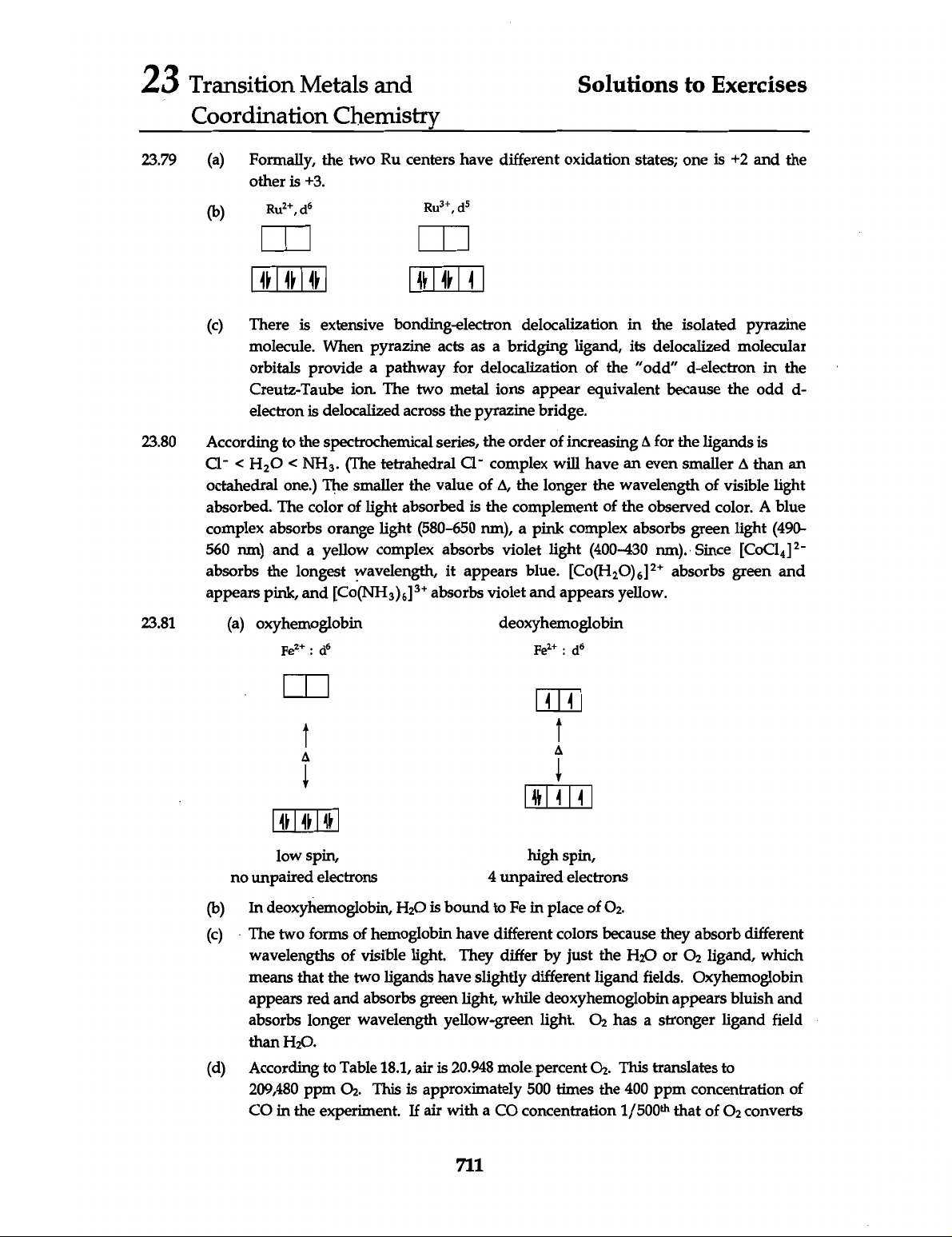 23 Transition Metals and Solutions to Exercises Coordination Chemistry 23.79 (a) Formally, the two Ru centers have different oxidation states; one is +2 and the other is +3. (b) Ru²⁺, d⁶ (c) There is extensive bonding-electron delocalization in the isolated pyrazine molecule. When pyrazine acts as a bridging ligand, its delocalized molecular orbitals provide a pathway for delocalization of the "odd" d-electron in the Creutz-Taube ion. The two metal ions appear equivalent because the odd d- electron is delocalized across the pyrazine bridge. 23.80 According to the spectrochemical series, the order of increasing for the ligands is Cl⁻
