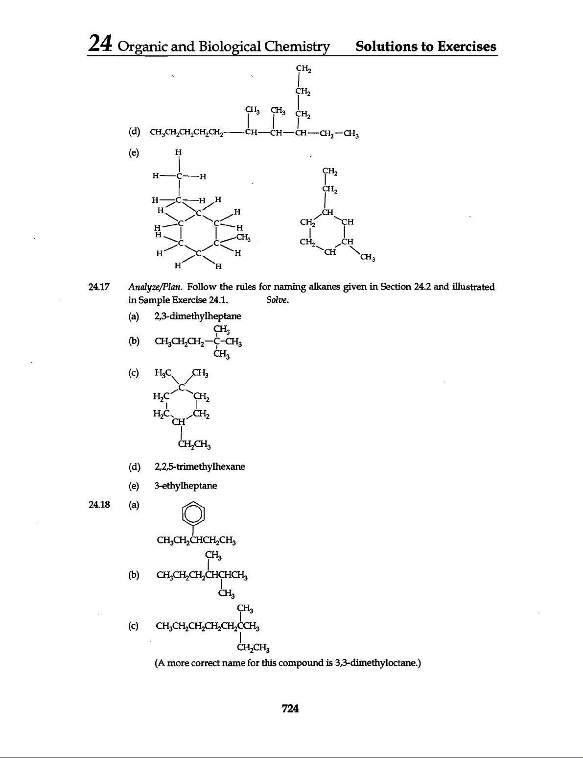 24 Organic and Biological Chemistry Solutions to Exercises CH₂ CH₂ CH₃ CH₃ CH₂ (d) CH₃CH₂CH₂CH₂CH₂ CH CH CH CH₃ (e) H CH₂ H C H CH₂ H C H H H C H CH C C CH₂ CH H H H CH₃ C C CH H C H CH CH₃ H H 24.17 Analyze/Plan. Follow the rules for naming alkanes given in Section 24.2 and illustrated in Sample Exercise 24.1. Solve. (a) 2,3-dimethylheptane CH₃ (b) CH₃CH₂CH₂ C-CH₃ CH₃ (c) CH₃ C CH₂ H2C CH₂ CH (d) 2,2,5-trimethylhexane (e) 3-ethylheptane 24.18 (a) CH₃ (b) CH₃ CH₃ (c) (A more correct name for this compound is 724