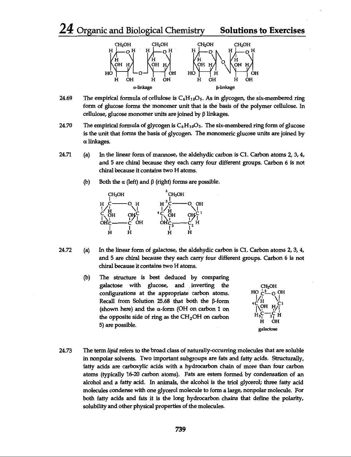 24 Organic and Biological Chemistry Solutions to Exercises CH₂OH H H H H H o H o H H H H H OH H OH H OH H OH H HO OH HO H OH H OH H OH H OH H OH α-linkage 24.69 The empirical formula of cellulose is C₆H₁₀O₅. As in glycogen, the six-membered ring form of glucose forms the monomer unit that is the basis of the polymer cellulose. In cellulose, glucose monomer units are joined by linkages. 24.70 The empirical formula of glycogen is C₆H₁₀O₅. The six-membered ring form of glucose is the unit that forms the basis of glycogen. The monomeric glucose units are joined by α linkages. 24.71 (a) In the linear form of mannose, the aldehydic carbon is C1. Carbon atoms 2, 3, 4, and 5 are chiral because they each carry four different groups. Carbon 6 is not chiral because it contains two H atoms. (b) Both the α (left) and (right) forms are possible. 6 5 H H H OH H 4 H OH OH OH 1 OH OH C OH OH 3 H H H H H 24.72 (a) In the linear form of galactose, the aldehydic carbon is C1. Carbon atoms 2, 3, 4, and 5 are chiral because they each carry four different groups. Carbon 6 is not chiral because it contains two H atoms. (b) The structure is best deduced by comparing galactose with glucose, and inverting the configurations at the appropriate carbon atoms. 5 OH Recall from Solution 25.68 that both the ß-form 4 C H C1 OH H (shown here) and the α-form (OH on carbon 1 on the opposite side of ring as the CH₂ OH on carbon 2 H H OH 5) are possible. galactose 24.73 The term lipid refers to the broad class of naturally-occurring molecules that are soluble in nonpolar solvents. Two important subgroups are fats and fatty acids. Structurally, fatty acids are carboxylic acids with a hydrocarbon chain of more than four carbon atoms (typically 16-20 carbon atoms). Fats are esters formed by condensation of an alcohol and a fatty acid. In animals, the alcohol is the triol glycerol; three fatty acid molecules condense with one glycerol molecule to form a large, nonpolar molecule. For both fatty acids and fats it is the long hydrocarbon chains that define the polarity, solubility and other physical properties of the molecules. 739