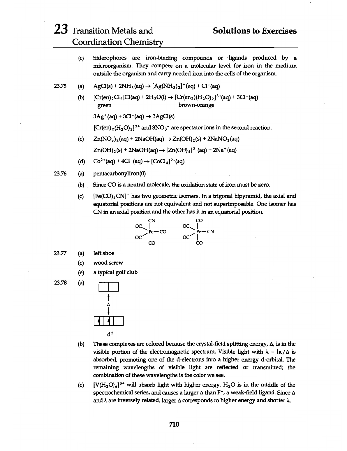 23 Transition Metals and Solutions to Exercises Coordination Chemistry (c) Siderophores are iron-binding compounds or ligands produced by a microorganism. They compete on a molecular level for iron in the medium outside the organism and carry needed iron into the cells of the organism. 23.75 (a) (b) + green brown-orange [Cr(en)₂(H₂O)₂]³⁺ and are spectator ions in the second reaction. (c) Zn(NO₃)₂(aq) + 2NaOH(aq) (d) + 23.76 (a) pentacarbonyliron(0) (b) Since CO is a neutral molecule, the oxidation state of iron must be zero. (c) has two geometric isomers. In a trigonal bipyramid, the axial and equatorial positions are not equivalent and not superimposable. One isomer has CN in an axial position and the other has it in an equatorial position. CN CO OC OC Fe CO Fe CN OC OC CO CO 23.77 (a) left shoe (c) wood screw (e) a typical golf club 23.78 (a) d² (b) These complexes are colored because the crystal-field splitting energy, is in the visible portion of the electromagnetic spectrum. Visible light with = is absorbed, promoting one of the d-electrons into a higher energy d-orbital. The remaining wavelengths of visible light are reflected or transmitted; the combination of these wavelengths is the color we see. (c) will absorb light with higher energy. H₂O is in the middle of the spectrochemical series, and causes a larger than F⁻, a weak-field ligand. Since and are inversely related, larger corresponds to higher energy and shorter 710