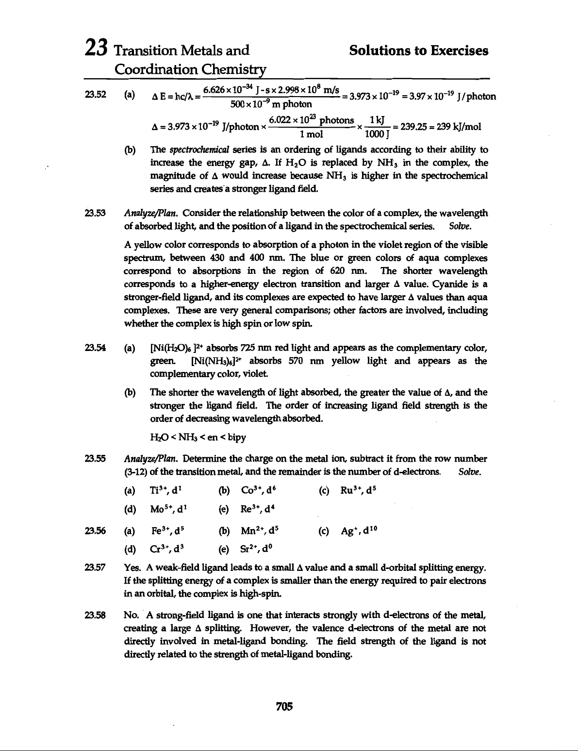 23 Transition Metals and Solutions to Exercises Coordination Chemistry 23.52 (a) 6.626 10⁻³⁴ J 2.998 10⁸ m/s = 3.973 10⁻¹⁹ = 3.97 10⁻¹⁹ J/ photon 500 10⁻⁹ m photon = 3.973 J/photon 6.022 photons = = kJ/mol 1 mol (b) The spectrochemical series is an ordering of ligands according to their ability to increase the energy gap, Д. If is replaced by in the complex, the magnitude of would increase because is higher in the spectrochemical series and stronger ligand field. 23.53 Analyze/Plan. Consider the relationship between the color of a complex, the wavelength of absorbed light, and the position of a ligand in the spectrochemical series. Solve. A yellow color corresponds to absorption of a photon in the violet region of the visible spectrum, between 430 and 400 nm. The blue or green colors of aqua complexes correspond to absorptions in the region of 620 nm. The shorter wavelength corresponds to a higher-energy electron transition and larger value. Cyanide is a stronger-field ligand, and its complexes are expected to have larger values than aqua complexes. These are very general comparisons; other factors are involved, including whether the complex is high spin or low spin. 23.54 (a) [Ni(H₂O)₆ absorbs 725 nm red light and appears as the complementary color, green. absorbs 570 nm yellow light and appears as the complementary color, violet. (b) The shorter the wavelength of light absorbed, the greater the value of 4, and the stronger the ligand field. The order of increasing ligand field strength is the order of decreasing wavelength absorbed.