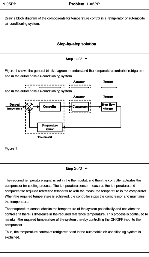 Problem 1.05PP Draw a block diagram of the components for temperature control in a refrigerator or automobile air-conditioning system. Step-by-step solution step 1 of 2 Figure 1 shows the general block diagram to understand the temperature control of refrigerator and in the automobile air-conditioning system. ActuMor Process and in the automobile air-conditioning system. Figure 1 Step 2 of 2 The required temperature signal is set in the thermostat, and then the controller actuates the compressor for cooling process. The temperature sensor measures the temperature and compares the required reference temperature with the measured temperature in the comparator. When the required temperature is achieved, the controller stops the compressor and maintains the temperature. The temperature sensor checks the temperature of the system periodically and actuates the controller if there is difference in the required reference temperature. This process is continued to maintain the required temperature of the system thereby controlling the ON/OFF input to the compressor. Thus, the temperature control of refrigerator and in the automobile air-conditioning system is explained.
