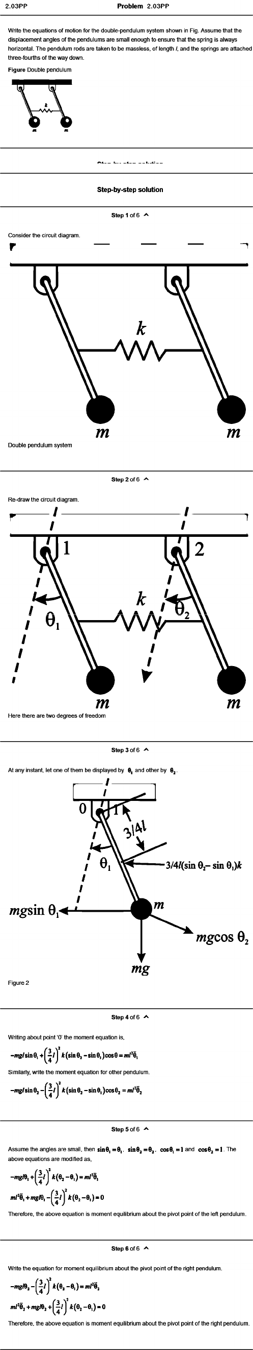 Problem 2.03PP Write the equations of motion for the double-pendulum system shown in Fig. Assume that the displacement angles of the pendulums are small enough to ensure that the spring is always horizontal. The pendulum rods are taken to be massless, of length /, and the springs are attached three-fourths of the way down. Step-by-step solution step 1 of 6 Consider the circuit diagram. r m m Double pendulum system Step 2 of 6 ^ Re-draw the circuit diagram. ̂ / I ^ / / 1 m Here there are two degrees of freedom Step 3 of 6 ^ At any instant, let one of them be displayed by 6| and other by 6,. Step 4 of 6 Writing about point ‘0’ the moment equation is. Jt(sinO2-sinO,)cos0sm /^d, Similarly, write the moment equation for other pendulu -mg/sin6, - ^ ^ / j *(sin6,-sine|)cos82 =m/^e. Step 5 of 6 Assume the angles are small, then sin0| s 0 |, cos9 |S ]and cos02 s l.T he above equations are modified as. * (e ,-e ,)= m /= 9 , Therefore, the above equation is moment equilibrium about the pivot point of the left pendulum. Step 6 of 6 ^ Write the equation for moment equilibrium about the pivot point of the right pendulum. * ( 6 , - 6 , ) - 0 Therefore, the above equation is moment equilibrium about the pivot point of the right pendulum.