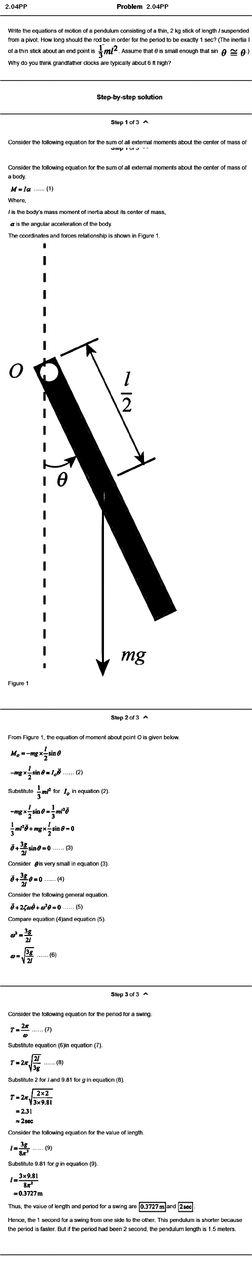 Problem 2.04PP Write the equations of motion of a pendulum consisting of a thin, 2 kg stick of length / suspended from a pivot. How long should the rod be in order for the period to be exactly 1 sec? (The inertia I of a thin stick about an end point is Assume that 0 is small enough that sin Q ^ Q.) Why do you think grandfather clocks are typically about 6 ft high? Step-by-step solution step 1 of 3 Consider the following equation for the sum of all external moments about the center of mass of Consider the following equation for the sum of all external moments about the center of mass of a body. M ^ I a ...... (1) Where. / is the body’s mass moment of inertia about its center of mass, a is the angular acceleration of the body. The coordinates and forces relationship is shown in Figure 1. o Figure 1 Step 2 of 3 From Figure 1, the equation of moment about point O is given below. M o = -m g n ^ s m 0 — ........(2) Substitute for /p in equation (2). -m g = ^ m /*tf+ mg X ̂ sin = 0 f l + ^ 8 i n f l = 0 ...... (3) 2i Consider ^ is very small in equation (3). g + ^ e = o (4) Consider the following general equation. ^+24^a>e+ai‘ f f= 0 (5) Compare equation (4)and equation (5). Step 3 of 3 ^ Consider the following equation for the period for a swing. r=— ....(7) Substitute equation (6)in equation (7). 2/r - 2 > r / - = - ...... (8) Substitute 2 for / and 9.81 for g in equation (8). r = 2 ; r j I 2x2 ’'V 3 x 9.8I = 2.31 = 2sec Consider the following equation for the value of length. /= -? § - (9) Substitute 9.81 for g in equation (9). 3x9.81/ * - 8^* * 0.3727 m Thus, the vaiue of length and period for a swing are [0.3727m]a Hence, the 1 second for a swing from one side to the other. This pendulum is shorter because the period is faster. But if the period had been 2 second, the pendulum length is 1.5 meters.