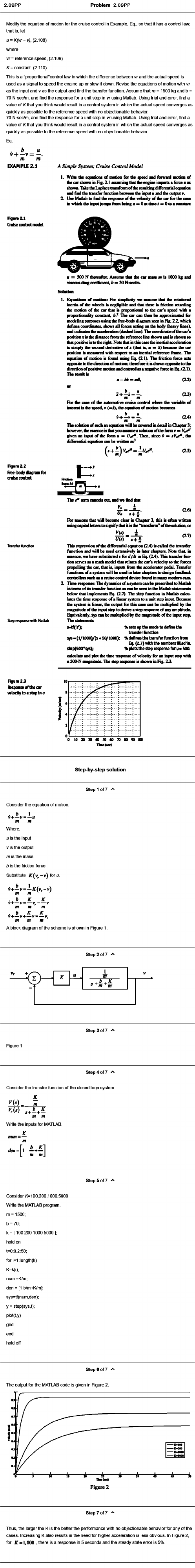 Problem 2.09PP Modify the equation of motion for the cruise control in Example, Eq., so that it has a control law; that is, let u = K (vr-v ), (2.108) where vr= reference speed. (2.109) /C= constant. (2.110) This is a “proportionarcontrol law in which the difference between \^rand the actual speed is used as a signal to speed the engine up or slow it down. Revise the equations of motion with vr as the input and v as the output and find the transfer function. Assume that/n = 1500 kg and b = 70 N -sec/m, and find the response for a unit step In vr using Matlab. Using trial and error, find a value of K that you think would result in a control system In which the actual speed converges as quickly as possible to the reference speed with no objectionable behavior. 70 N -sec/m, and find the response for a unit step In vr using Matlab. Using trial and error, find a value of K that you think would result in a control system In which the actual speed converges as quickly as possible to the reference speed with no objectionable behavior. Eq. b u V H— V = —. m m EXAMPLE 2.1 A Simple System; Cruise Control Model 1. Write die equedon of motion for the ipeed m l forward motion of lhecaribownmFig.2.1 aasnmiiig that the en^ne imparta a force ■ ae abown. Take the Laplace transform of the reauiting differential eqoadon and find the transfer function between the input« and the output v. 2. Use Matlab to 6nd the response of the velocity of the car for the case in which the inpntjumpe from being « = Oat time f = 0 to a constant Hgui«2.1 Cruise control model « B 500 N thereafter. Assume that the car a visoous drag coeflkient, b B 50 N*secAn. I « is 1000 kg and Solution 1. Equations of motion: For sunpBdty we asanme that the rotmkNinl inertia o f the wheeb b negligible and that there b ftiction retarding the motion of the car that b proportional to the car’s speed with a proportionality constant, The car can then be approximated for modeling poipoeea using the ftee-body diagram men m Fig. 2.2, which defines coordinmes, shows all forces acting on the body (heavy lineaX and imficates the accdetaCion (dashed line). The coordinate of the car’a positioo X u the distaoce from the refotenoe line sbo«m and b chosen ao that positive isto the r i ^ Note that in this case the meitial acceleration u amply the second derivative of x (that is, a * x) because the car position b measured wkh respect to « inertial reference frame. The equation of motion b found mung Eq. (2.1). The friction force acts opposite to the direction motiMi; therefore k b drawn rqiposhe to the direction o f positive motion m l eiketcd as a negative fioroe in Eq. (2.1). Theresukb (2.2) ^ b . M X + — X = — . 03) For the case of the automotive cruise control where the variable of interest b the speed, v ( ^ ) , the equbion of motion becomes * “ 0 .4 )V + —V B —. H k sobtion of wch an equation win be cowered in detail in Q upter 3; however, the essence b that you aaaume a aolotionoftfae form v s pvea an input o f the form ■ b Then, tince v b the differential equation chi be written aa^ 03) Rgurt2,2 r>co body diagram for t:: 0 6 ) a7) Step response wtth Hatlab The c* term C H iceb out, and we find that V -!■ yg _ m « . . + 1 ' For reasons that will become efetf in Quqker 3, this b often written using capital letters to signify that k b the‘Itunsforro'’of the solution, or v w _ i * + h ' This expresskm of die dUferential equation (2.4) b called the tran ti’er function and wiD be used extensively m later chapters. Note that, in essence, we have aubstkuled i fof dfdt in Eq. (Z4X Thb transfer Auh tion serves as a mwh model that relates the ch ’s velocity to the forces propelling the car, that b , inputs from the accelerator pedal. Transfer functions of a system will be used in later chapters to design feedback corXrollers such as a cruise control device found in many modern cars. X Time reaponae: The dynamics ofn system can be prescribed to Matlab in terms of its transfer function as can be seen in the Matlab statemenb below that implemeiits EN magnitude. The Mep responae b shown m Fig. 2.3. Rgure2.3 Response of the car velodtytoastepinti Step-by-step solution step 1 of 7 Consider the equation of motion. V + — V ® — IT Where, u is the input V is the output m is the mass b is the friction force Substitute JC (v^-v) foru. m m . b K K V + — V * — V ,------- V m m m . b K K V + — V + — V = — V- m m m A block diagram of the scheme is shown in Figure 1. Step 2 of 7 1 u m . b . K Step 3 of 7 Figure 1 Step 4 of 7 Consider the transfer function of the closed loop system. y (s ) K (x ) b K S + — + — m m Write the inputs for MATLAB. K m den I m mj Step 5 of 7 Consider K=100,200,1000,5000 Write the MATLAB program, m = 1500; b = 70; k = [100 200 1000 5000]; hold on t=0:0.2:50; for i=1:length(k) K=k(i); num =K/m; den = [1 b/m+K/m]; sys=tf(num,den); y = step(sys,t); plot(t,y) grid end hold off Step 6 of 7 The output for the MATLAB code is given in Figure 2. Step 7 of 7 Thus, the larger the K is the better the performance with no objectionable behavior for any of the cases. Increasing K also results in the need for higher acceleration is less obvious. In Figure 2, for K - 1,000 , there is a response in 5 seconds and the steady state error is 5%.