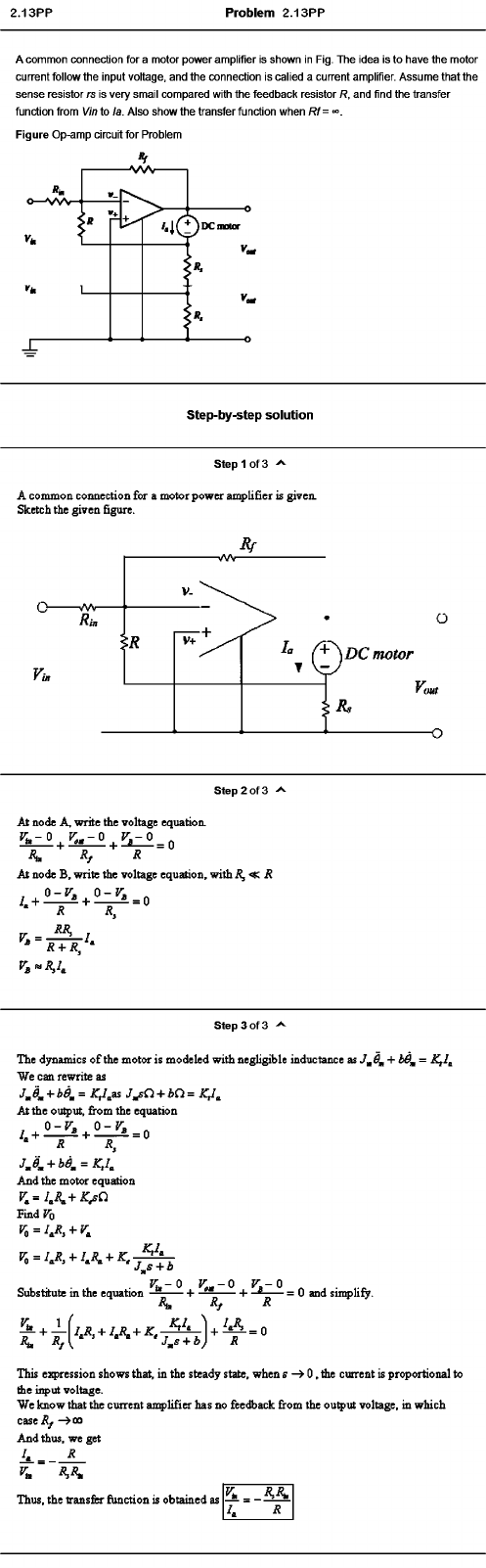 Problem 2.13PP A common connection for a motor power amplifier is shown in Fig. The idea is to have the motor current follow the input voltage, and the connection is calied a current amplifier. Assume that the sense resistor rs is very smail compared with the feedback resistor R. and find the transfer function from Vin to la. Also show the transfer function when Rf= Figure Op-amp circuit for Problem Step-by-step solution step 1 of 3 A common connection for a motor power an^lifier is given. Sketch the given figure. Step 2 of 3 At node A, write the voltage equation. V L -0 ^ R At node B, write the voltage equation, with R^-^ R , 0 - f% 0 - V . , R R, ^ r + r / ‘ step 3 of 3 ^ The d3mamics o f the motor is modeled with negligible inductance as J^9^ + We can rewrite as 4 , + * 4 = A'^.as + At the ou^ut, &om the equation , 0 - r . 0 - r . ,, R 5 , j , e ,+ b e , = K,i^ And the motor equation Find To V„ = l^R, + I^R^^■ K, J^s -I- b y — 0 V —0 V — 0 Substitute in the equation ------ 1- — = 0 and sinqjlify. R^ Rj R R^ 5 ,1 .* ■ • J , s ^ b ) R This e^^ression shows that, in the steady state, when s —> 0 , the current is proportional to the ii^ut voltage. We know that the current anq^lifier has no feedback from the output voltage, in which And thus, we get U _ R y>. Thus, the transfer fimction is obtained as ^ - - M l U R