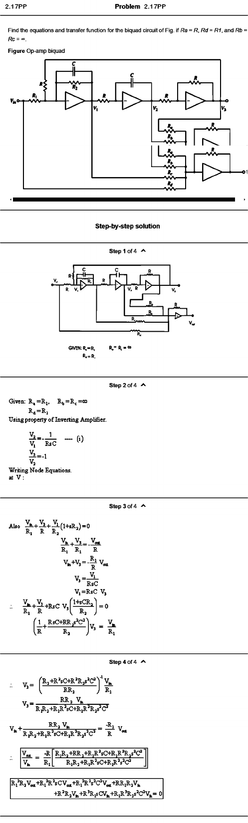 Problem 2.17PP Find the equations and transfer function for the biquad circuit of Fig. if Ra = R ,Rd= R1. and Rb = Rc=-^. Figure Op-amp biquad Step-by-step solution step 1 of 4 Step 2 of 4 Given: R ,= R i, Rv=R,=oo R ,= R . Using property o f Inverting Amplifier. V, RsC ' ^ = - 1 V, Writing Node Equations, at V : Step 3 of 4 Also ^ + ^ + ^ r i + s R j ) = 0 R, R R / R, R i R V „+V , = - ^ V „ V ,= V, RsC V ,=R sC V, R, R ’I Rs J 1 1 ̂ RsC+RR^^C^’l ^ W R s r ~ R i Step 4 of 4 [■r J+R’ sC+R’ R /C ? Y Vfc ' I RRs J R. R R , V., ’ R ^ j+ R ,R "sC + R ,R "R js"C ? RR , V_ -R,V J._______ ^-^2 v ^ R ,R j+R,R^sC+R,R’ Rjs’ c ' r V „ -R R ,R ,+R R ,+R ,R ’ sC+R,R’R,s“C?' V i R. R iR j+ R iR ’ sC+R,R’ s^C? R i^ sV „ + R i’R ’ sC V „+ R i^ ’ ŝ C?V„+RR iR jV4 +R“R jV j,+R ’ R isC V ^+ R iR ^ js “C?Vi= 0