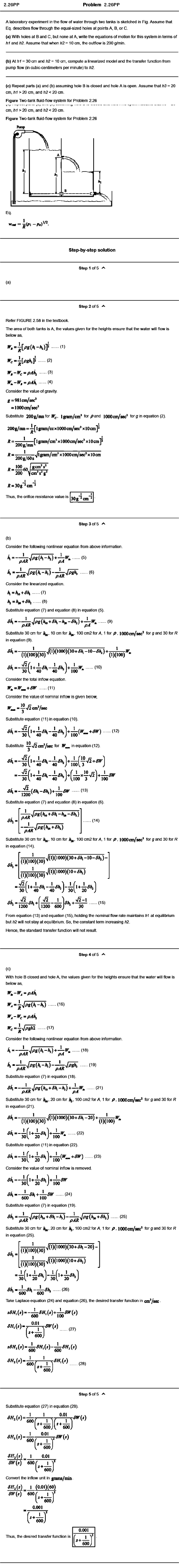 Problem 2.26PP A laboratory experiment in the flow of water through two tanks is sketched in Fig. Assume that Eq. describes flow through the equal-sized holes at points A, B, or C. (a) With holes at B and C. but none at A, write the equations of motion for this system in terms of h1 and h2. Assume that when /?2 = 10 cm, the outflow is 200 g/min. (b) At h1 = 30 cm and h2= ^0 cm, compute a linearized model and the transfer function from pump flow (in cubic-centimeters per minute) to h2. (c) Repeat parts (a) and (b) assuming hole B is closed and hole A is open. Assume that h3 = 20 cm, h i > 20 cm, and h2 20 cm, and h2 J ? s 3 0 g ^c m 2 30g ^cm Step 3 of 5 (b) Consider the following nonlinear equation from above information. (5) (6) Consider the linearized equation. (7) ..........(8 ) Substitute equation (7) and equation (8) in equation (5). 1 /— 7Z— 7:— r— i Substitute 30 cm for 10 cm for Aj,, 100 cm2 for A, 1 for /?, IQOQcip/sfC ̂ for g and 30 for R in equation (9). Sh,= -̂ (1)(I0O0)(30+5*i-1O-5^)h(1)(100)(30)' s k = - 2 ^ f i + - L t f k — L t f t V J - K’ 30i, 40 ’ 40 100 " (1)(100) ( 10) Consider the total inflow equation. W ^ = W ^ + S W ...... (11) Consider the value of nomina! Inflow Is '̂ Iven below 10 = y > ^ c m V s e c Substitute equation (11) in equation (10). 1 - - L a A . l + - L ( » ' + ^ » ') ’ 3 0 l, 40 ’ 40 lo o ' ” ’ .(12) Substitute y -v ^ c m ’ /sec for in equation (12). S k — —