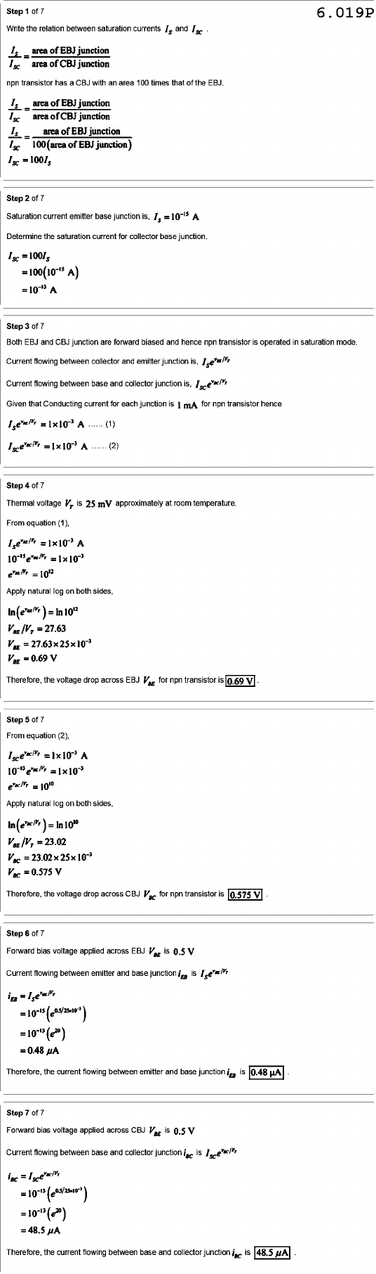 Step of 7 6.019P Write the relation between saturation currents and = area of EBJ junction area of CBJ junction npn transistor has a CBJ with an area 100 times that of the EBJ. Iₛ = area of EBJ junction area of CBJ junction = area of EBJ junction 100 (area of EBJ junction) Step of 7 Saturation current emitter base junction is, = Determine the saturation current for collector base junction. 100/s = A) Step of 7 Both EBJ and CBJ junction are forward biased and hence npn transistor is operated in saturation mode. Current flowing between collector and emitter junction is, Current flowing between base and collector junction is, Given that Conducting current for each junction is 1 mA for npn transistor hence (1) = A (2) Step of 7 Thermal voltage is 25 mV approximately at room temperature. From equation (1), Apply natural log on both sides, Therefore, the voltage drop across EBJ for npn transistor is 0.69 V Step of 7 From equation (2), Apply natural log on both sides, Therefore, the voltage drop across CBJ for npn transistor is 0.575 V Step of 7 Forward bias voltage applied across EBJ is V Current flowing between emitter and base is = = = 0.48 Therefore, the current flowing between emitter and base junction is Step of 7 Forward bias voltage applied across CBJ is V Current flowing between base and collector junction isc is = = = 48.5 Therefore, the current flowing between base and collector junction isc is