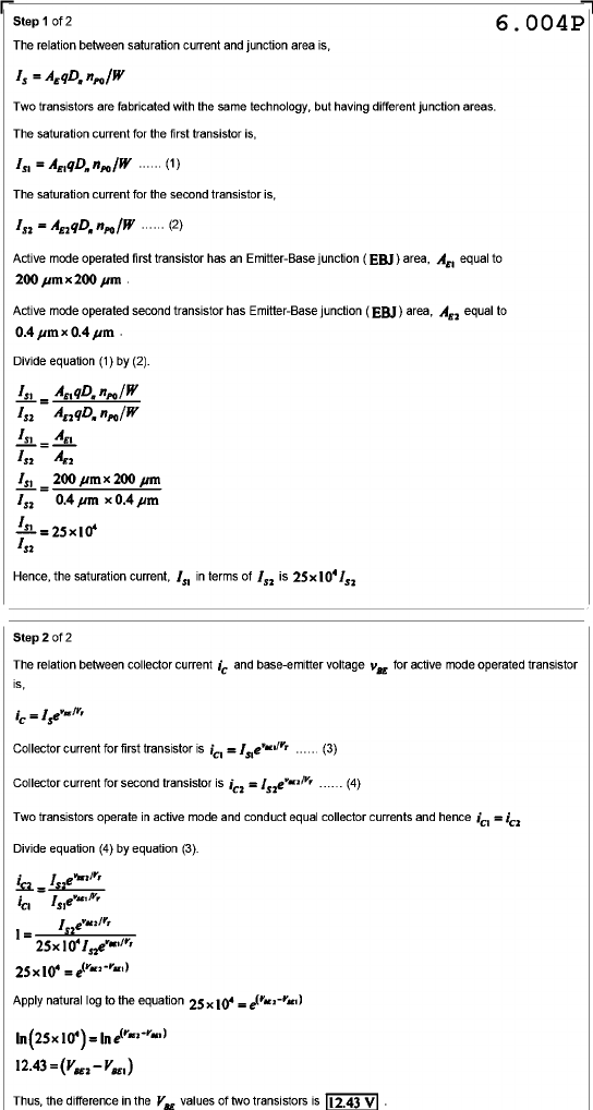 Step 1 of 2 6.004P The relation between saturation current and junction area is, Two transistors are fabricated with the same technology, but having different junction areas. The saturation current for the first transistor is, (1) The saturation current for the second transistor is, (2) Active mode operated first transistor has an Emitter-Base junction (EBJ) area, equal to 200 Active mode operated second transistor has Emitter-Base junction (EBJ) area, equal to 0.4 µm 0.4 Divide equation (1) by (2). = = Hence, the saturation current, in terms of is Step 2 of 2 The relation between collector current ic and base-emitter voltage for active mode operated transistor is, Collector current for first transistor is (3) Collector current for second transistor is (4) Two transistors operate in active mode and conduct equal collector currents and hence Divide equation (4) by equation (3). = 1 = Apply natural log to the equation Thus, the difference in the values of two transistors is 12.43 V