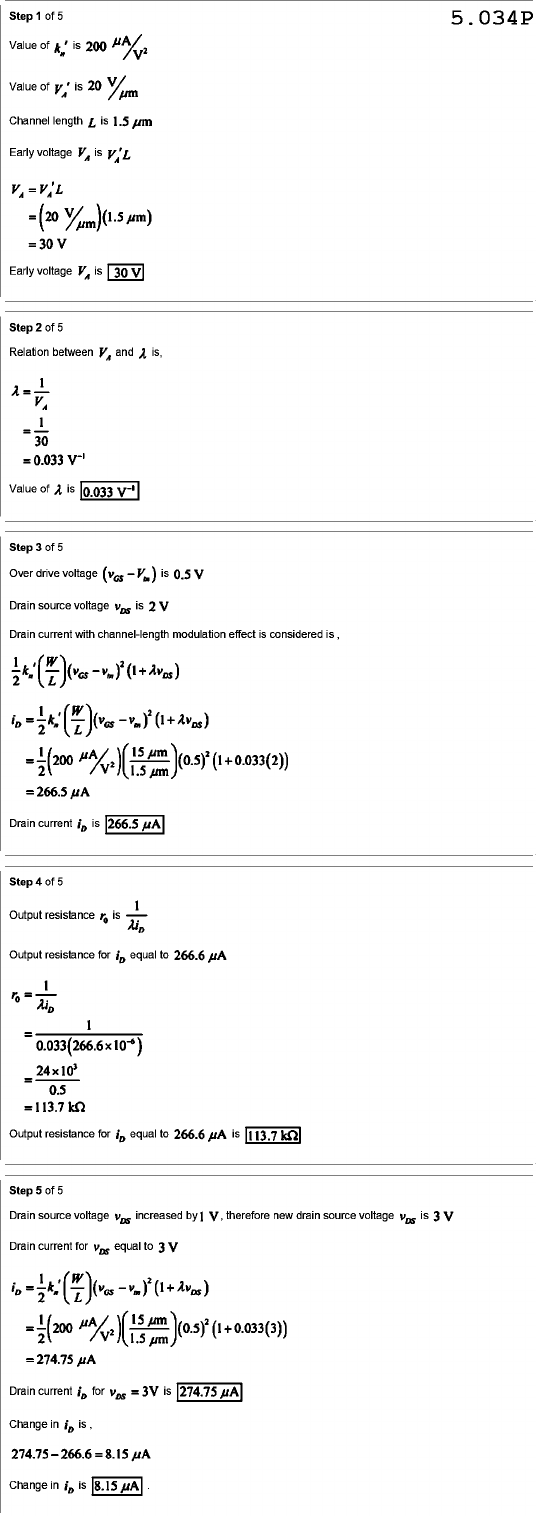 Step of 5 5.034P Value of kn' is 200 Value of is Channel length L is 1.5 µm Early voltage is = 30 V Early voltage is 30 V Step 2 of 5 Relation between and is, 1 = 30 = 0.033 V⁻¹ Value of is 0.033 V⁻¹ Step 3 of 5 Over drive voltage is 0.5 V Drain source voltage VDs is 2 V Drain current with channel-length modulation effect is considered is, = 266.5 Drain current is Step 4 of 5 Output resistance Output resistance for equal to 266.6 µA = 1 1 = = 0.5 = 113.7 kΩ Output resistance for equal to 266.6 µA is Step 5 of 5 Drain source voltage VDs increased by 1 V, therefore new drain source voltage is 3 V Drain current for VDs equal to 3V = 274.75 Drain current for = 3V is 274.75 Change in is Change in is