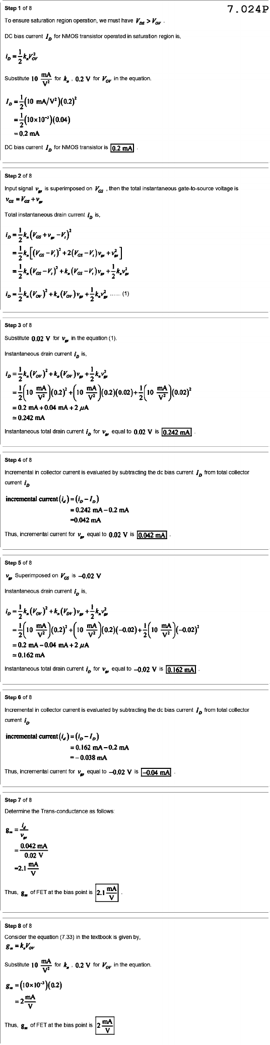 Step of 8 7.024P To ensure saturation region operation, we must have DC bias current for NMOS transistor operated in saturation region is, Substitute 10 mA for k, 0.2 for in the equation. =0.2 mA DC bias current for NMOS transistor is 0.2 mA Step of 8 Input signal is superimposed on then the total instantaneous gate-to-source voltage is Total instantaneous drain current iD is, Step of 8 Substitute 0.02 V for in the equation (1). Instantaneous drain current iD is, = = 0.2 mA+0.04 mA +2 = 0.242 mA Instantaneous total drain current iD for equal to 0.02 V is 0.242 mA Step of 8 Incremental in collector current is evaluated by subtracting the dc bias current from total collector current iD incremental current = 0.242 mA-0.2 mA =0.042 mA Thus, incremental current for equal to 0.02 V is 0.042 = mA Step of 8 Superimposed on is -0.02 V Instantaneous drain current is, = = 0.2 mA-0.04 mA = Instantaneous total drain current for equal to -0.02 V is 0.162 mA Step of 8 Incremental in collector current is evaluated by subtracting the dc bias current from total collector current incremental current = 0.038 mA Thus, incremental current for equal to -0.02 V is -0.04 mA Step of 8 Determine the Trans-conductance as follows: 0.042 mA = 0.02 V mA Thus, 8m of FET at the bias point is 2.1 V Step of 8 Consider the equation (7.33) in the textbook is given by, Substitute 10 mA for 0.2 for in the equation. mA Thus, 8m of FET at the bias point is 2 V