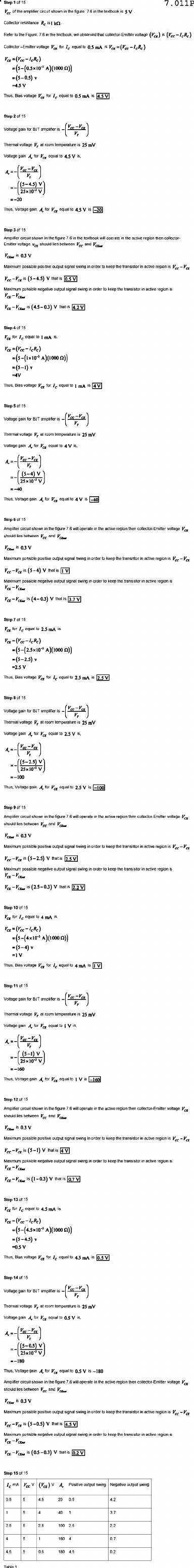 Step 7.011P Collector resistance Refer Collector for =4.5 V Thus Step 2 of 15 25 mV =-20 Thus Voltage operate active collector Maximum keep the transistor =4V for 25 mV gain Thus operate the collector voltage sign keep transisto that Maximum der Step 7 of 15 =2.5 V equal to Thermal voltage V, 25 mV Voltage gain equal to Step 9 of 15 the active collector keep th transistor Maximum negative the transistor in active Step 10 of 15 Step 11 of 15 Thermal 25 mV =-160 Thus, Voltage Step 12 of 15 shown in operate the then collector Emitte voltage between orde keep region Maximum the Step 13 of 15 Thus 0.5 V Step Thermal voltage 25 mV Voltage gain Thus operate the collector voltage Maximum the ansistor region is 0.2 V Step 15 of 15 swing Negative swing 0.5 5 4.5 20 0.5 4.2 - 5 4 40 100 4 5 1 160 0.7 4.5 5 0.2 Table 1