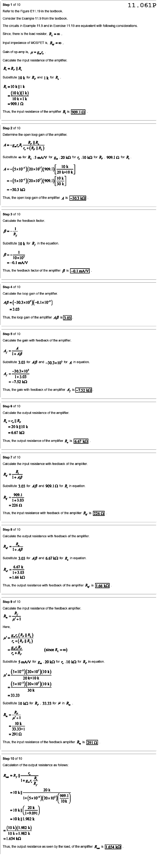 Step 10 11.061P Refer to the Figure E11.19 the textbook Consider the Example 11. from the textbook The circuits in Example 11.9 and in Exercise 11 19 are equivalent with following considerations Since, there is the load resistor. Input impedance of MOSFET is, Gain of op-amp is, Calculate the input resistance of the amplifier. Substitute 10k for and for R, (10k)(1k) 10k Thus, the input resistance of the amplifier R, is 909.1 Step 10 Determine the open loop gain the Substitute for mA/V for for 10 for for 10k 10k Thus, the open loop gain of the amplifier A Step 3 of 10 Calculate the feedback factor Substitute 101 for R, in the equation 10x10 mA/V Thus, the feedback factor of the amplifier Step 4 of 10 Calculate the loop gain of the amplifier =3.03 Thus, the loop gain the amplifier AB 3.03 Step 10 Calculate the gain with feedback of the A Substitute 3.03 for AB and for A 1+3.03 Thus, the gain with feedback of the amplifier A, is Step 10 Calculate the output resistance of the Thus, the output resistance of the amplifier is Step 10 Calculate the input resistance with feedback of the amplifier R, 1+AB Substitute 3.03 for AB and for R, equation 909.1 1+3.03 Thus the input resistance with feedback of the amplifier is Step 8 of 10 Calculate the output resistance with feedback of the amplifier 1+AB Substitute 3.03 for AB and 6.67 for equation 1+3.03 Thus, the output resistance with feedback of the amplifier Step 10 Calculate the input resistance of the feedback amplifier. Here, (since Substitute mA/V for for for R, in equation 20k+10k 30k =33.33 Substitute 10 for 33.33 for in 10k - 33.33+1 Thus, the input resistance the feedback amplifier is Step 10 Calculation the output resistance as follows: r. 20k 909.1 10k 1+9.091 Thus, the output resistance as seen by the load, of the amplifier is