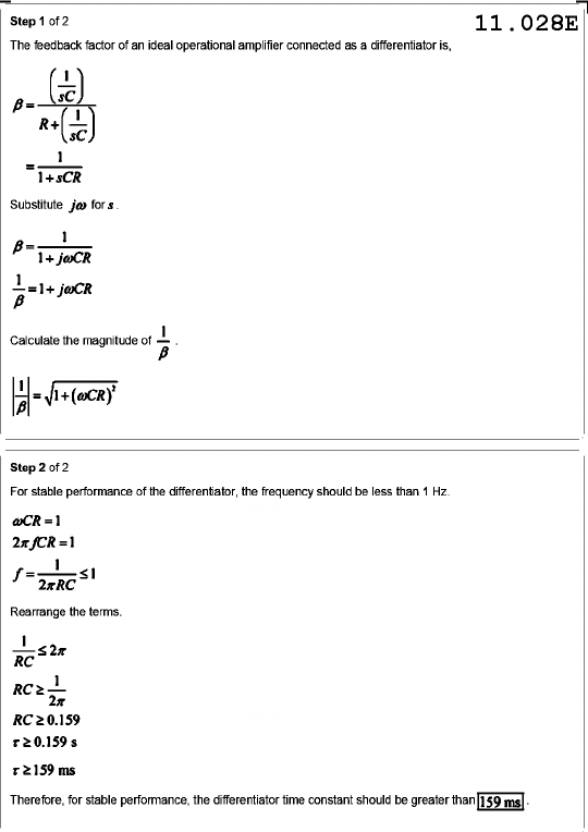 Step 1 of 2 11.028E The feedback factor of an ideal operational amplifier connected as a differentiator is, Substitute for Calculate the magnitude of 1/B Step 2 of 2 For stable performance of the differentiator, the frequency should be less than 1 Hz. 2πfCR=1 Rearrange the terms. ms Therefore, for stable performance, the differentiator time constant should be greater than 159 ms