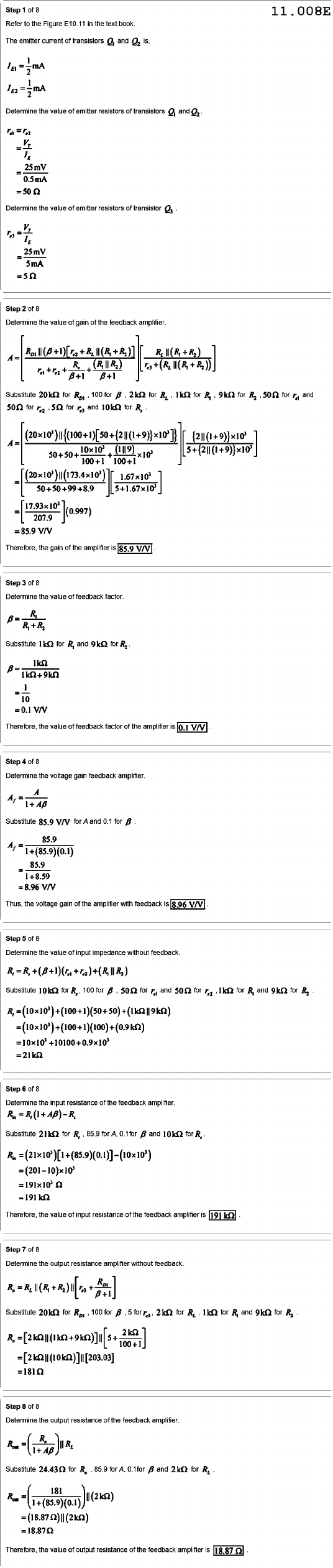 Step of 8 11.008E Refer to the Figure E10.11 in the text book. The emitter current of transistors and is, Determine the value of emitter resistors of transistors and 25mV 0.5mA Determine the value of emitter resistors of transistor 25mV 5mA =5Ω Step 8 Determine the value of gain of the feedback amplifier. A= A R, B+1 Substitute for 100 for 2kQ for 1kQ for 9kQ for R2 for and for 5Ω for and for R, A= A 10x10 50+50+ 100+1 100+1 = 50+50+99+8.9 = (0.997) 207.9 =85.9 V/V Therefore, the gain of the amplifier is 85.9 V/V Step Determine the value of feedback factor. Substitute 1kQ for and 9kQ for R2 10 =0.1 V/V Therefore, the value of feedback factor of the amplifier is 0.1 V/V Step of 8 Determine the voltage gain feedback amplifier. A Substitute 85.9 V/V for A and 0.1 for 85.9 1+(85.9)(0.1) 85.9 1+8.59 =8.96 V/V Thus, the voltage gain of the amplifier with feedback is 8.96 V/V Step Determine the value of input impedance without feedback Substitute for R, 100 for for and for 1kQ for and 9kQ for R2 Step of Determine the input resistance of the feedback amplifier. Substitute for 85.9 0.1for and 10kQ for =191kQ Therefore, the value of input resistance of the feedback amplifier is Step of 8 Determine the output resistance amplifier without Substitute for 100 for 2kQ for 1kQ for and 9kQ for R2 100+1 =181Ω Step of 8 Determine the output resistance of the feedback amplifier. Substitute for 85.9 for A, 1for and 2kQ for 181 1+(85.9)(0.1) Therefore, the value of output resistance of the feedback amplifier is 8.87