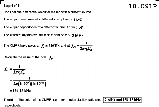 Step 1 of 1 10.091P Consider the differential amplifier biased with a current source. The output resistance of a differential amplifier is 1 MQ The output capacitance of a differential amplifier is 1 pF The differential gain exhibits a dominant pole at 2 MHz The CMRR have poles at f, = 2 MHz and at Calculate the value of the pole, 1 = Therefore, the poles of the CMRR (common mode rejection ratio) are, 2 MHz and 159.15 kHz respectively.