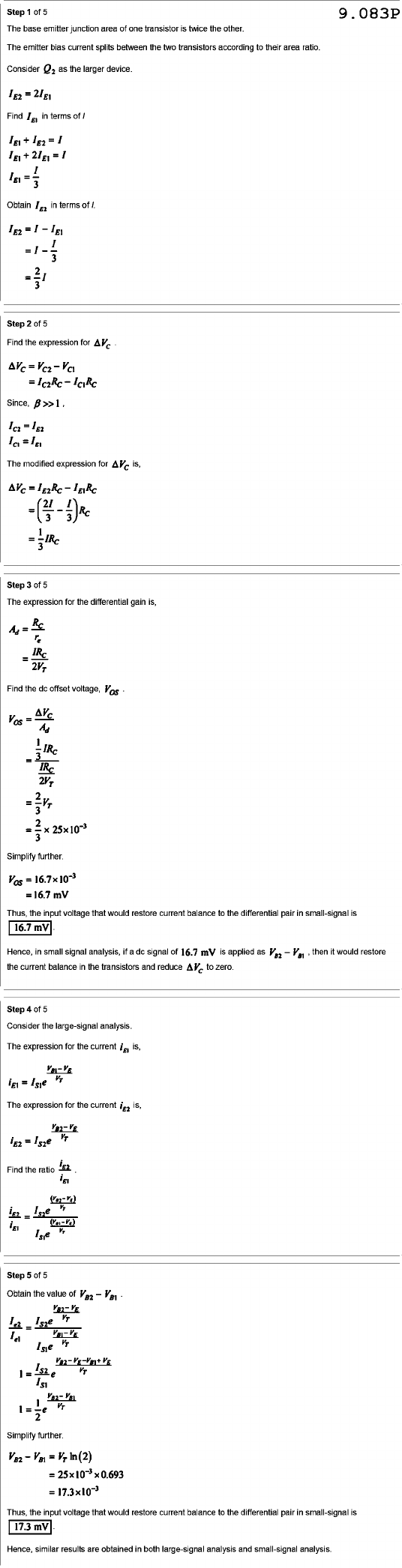 Step of 5 9.083P The base emitter junction area of one transistor is twice the other. The emitter bias current splits between the two transistors according to their area ratio. Consider as the larger device. Find in terms of Obtain in terms of Step of 5 Find the expression for Since, The modified expression for Vc is, = 1 Step of 5 The expression for the differential gain is, = Find the dc offset voltage, Ad = = Simplify further. 16.7 mV Thus, the input voltage that would restore current balance to the differential pair in small-signal is 16.7 mV mV Hence, in small signal analysis, if a dc signal of 16.7 mV is applied as then it would restore the current balance in the transistors and reduce Vc to zero. Step of 5 Consider the large-signal analysis. The expression for the current is, The expression for the current is, Find the ratio Step of 5 Obtain the value of VT VT 2 Simplify further. = Thus, the input voltage that would restore current balance to the differential pair in small-signal is 17.3 17.3 mV Hence, similar results are obtained in both large signal analysis and small signal analysis.