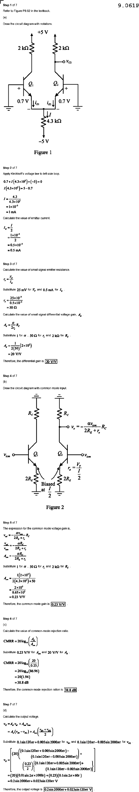 Step 9.061P Refer Figure P8.62 in the textbook (a) Draw the circuit with notations + + 0.7 V 0.7 V Figure 1 Step 2 of 7 Apply Kirchhoff's voltage law to left side 4.3 4.3x10 mA Calculate the value emitter current 2 =0.5 mA Step 3 of 7 Calculate the value of small signal emitter resistance E Substitute 25 mV for V, and 0.5 mA for =50 Ω Q Calculate the value of small signal differential voltage gain, Substitute for a for and for Rc 2(50) Therefore, the differential gain 20 V/V Step 4 of 7 (b) Draw the circuit diagram with common mode input - - Vicm 2R, 2 Biased at 2 Figure 2 Step 5 of 7 The expression for the common mode voltage 2RE Substitute for for and for Rc 8.65x10 =0.23 V/V the common-mode gain is 0.23 V/V Step 6 of 7 (c) Calculate the value of common-mode rejection CMRR Substitute 0.23 V/V for and 20 V/V for 20 CMRR 0.23 =20(1.94) =38.8 dB Therefore, the common-mode rejection ration 38.8 dB Step 7 of 7 (d) Calculate the output 2 Substitute sin sin for and sin for (20) 0.23 + Therefore, the output voltage V