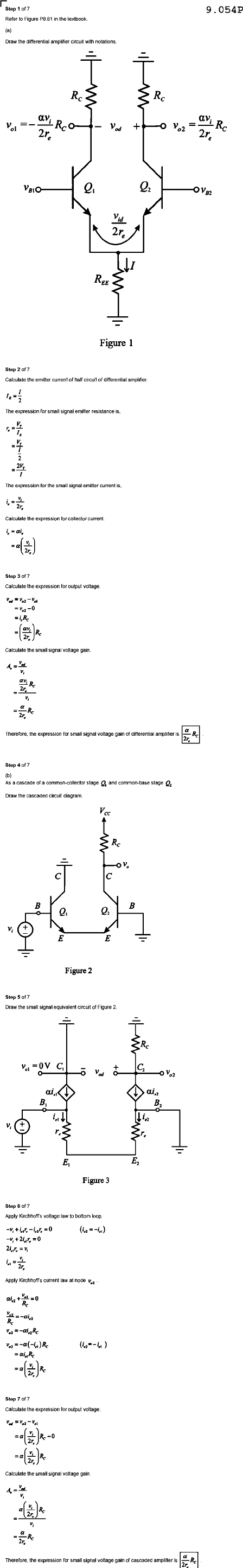 Step 1 of 7 9.054P Refer to P8.61 in the (a) Draw the differential amplifier with notations Rc Rc av, = Rc + = Rc 2r, 2r, e Vid 2r, I Figure 1 Step of 7 Calculate the emitter half circuit of amplifier The expression for small signal emitter resistance 2 2V, The expression for the small signal emitter current is, 2r, Calculate the expression for collector current Step 3 of 7 Calculate expression for output voltage av, 2r, Calculate small signal voltage av, 2r, a Therefore, the expression for small signal voltage gain differential 2r, Step (b) As cascade of a common-collector stage & common-base stage Q2 Draw the cascaded circuit Vcc Rc - C C B B + E E I Figure 2 Step Draw the small signal equivalen circuit of Figure 2. - Rc 0V C, - + C2 10 v, r. E2 Figure 3 Step Apply law bottom loop Apply Kirchhoff current law node Rc Step Calculate expression for output =a 2r, Calculate the small signal voltage gain a 2r, a 2r, the expression for small signal voltage gain o of cascaded amplifier
