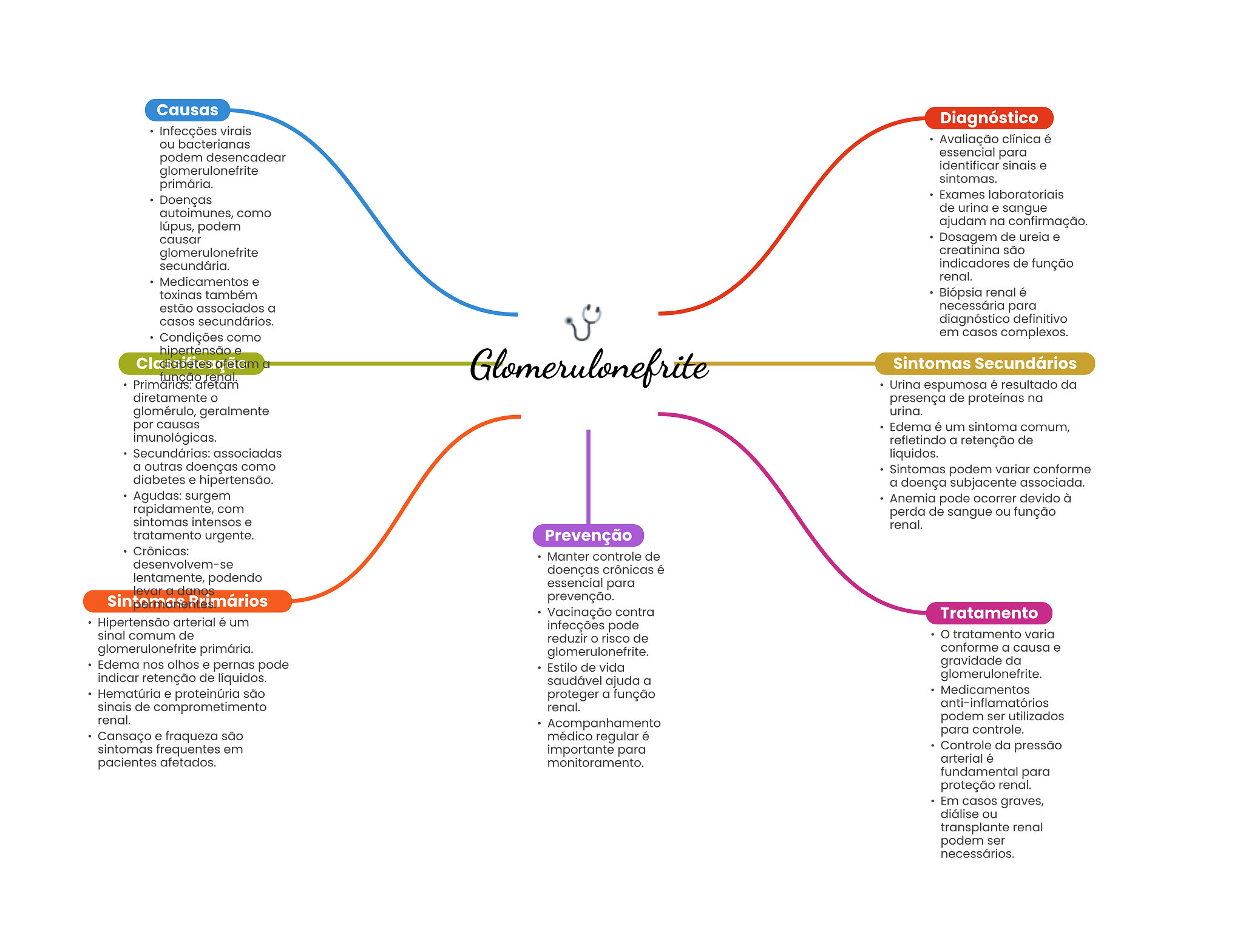 Causas Diagnóstico Infecções virais ou bacterianas Avaliação clínica é podem desencadear essencial para identificar sinais e glomerulonefrite sintomas. primária. Exames laboratoriais Doenças autoimunes, como de urina e sangue lúpus, podem ajudam na confirmação. causar Dosagem de ureia e glomerulonefrite creatinina são secundária. indicadores de função Medicamentos e renal. toxinas também Biópsia renal é estão associados a necessária para casos secundários. diagnóstico definitivo Condições como em casos complexos. hipertensão e afetam função renal. Glomerulonefrite Sintomas Secundários Primarias: afetam Urina espumosa é resultado da diretamente presença de proteínas na glomérulo, geralmente urina. por causas Edema é um sintoma comum, imunológicas. refletindo a retenção de Secundárias: associadas líquidos. a outras doenças como Sintomas podem variar conforme diabetes e hipertensão. a doença subjacente associada. Agudas: surgem Anemia pode ocorrer devido à rapidamente, com perda de sangue ou função sintomas intensos e renal. tratamento urgente. Prevenção Crônicas: Manter controle de desenvolvem-se doenças crônicas é lentamente, podendo essencial para levar a danos Primários prevenção. Vacinação contra Tratamento Hipertensão arterial é um infecções pode sinal comum de reduzir risco de tratamento varia glomerulonefrite primária. glomerulonefrite. conforme a causa e Edema nos olhos e pernas pode Estilo de vida gravidade da indicar retenção de líquidos. saudável ajuda a glomerulonefrite. Hematúria e proteinúria são proteger a função Medicamentos sinais de comprometimento renal. anti-inflamatórios renal. Acompanhamento podem ser utilizados Cansaço e fraqueza são médico regular é para controle. sintomas frequentes em importante para Controle da pressão pacientes afetados. monitoramento. arterial é fundamental para proteção renal. Em casos graves, diálise ou transplante renal podem ser necessários.