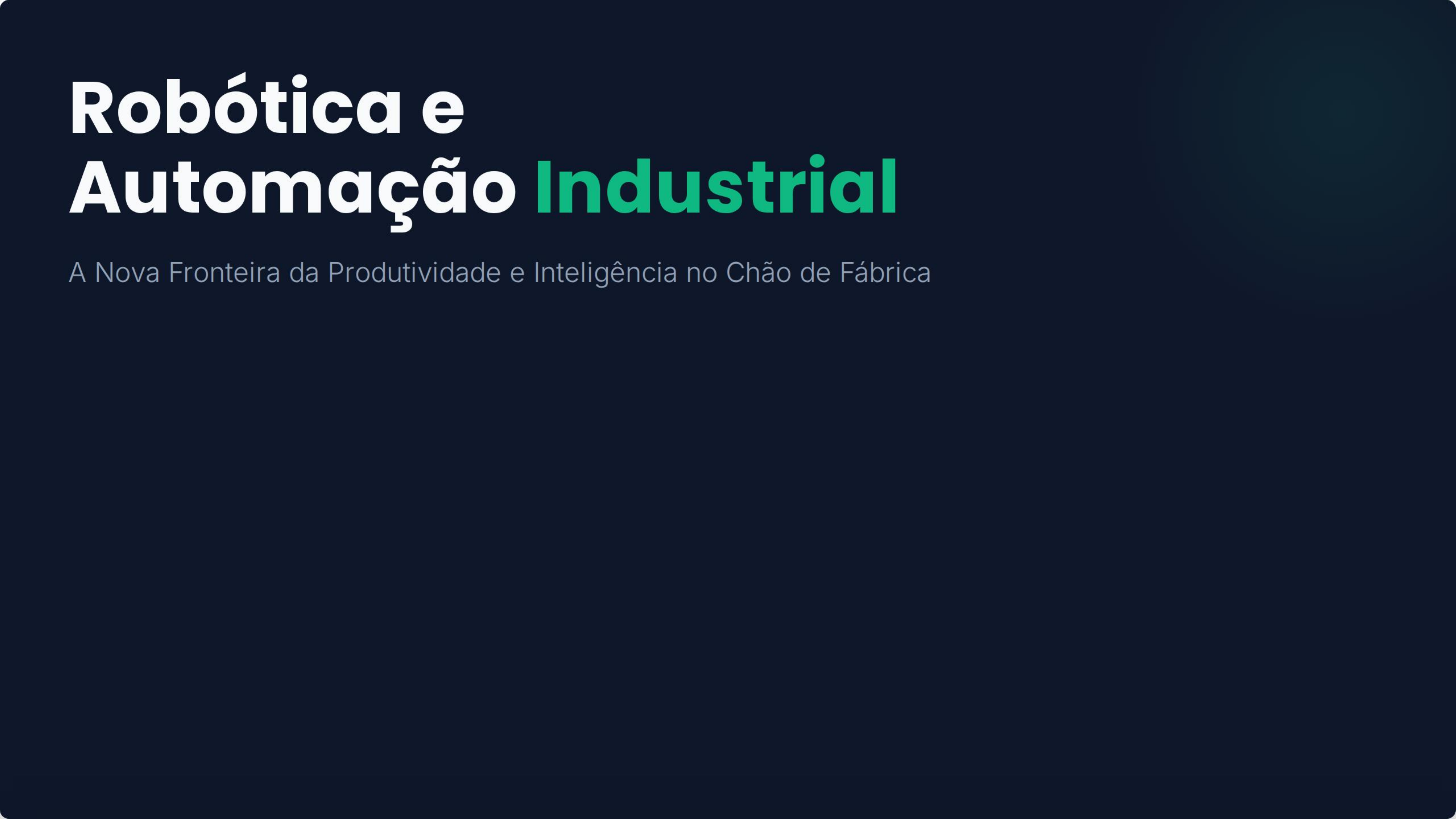 Robótica e Automação Industrial A Nova Fronteira da Produtividade e Inteligência no Chão de FábricaFundamentos e Evolução A transição da manufatura mecânica para sistemas cibernéticos inteligentes.Pilares da Automação Moderna Precisão Extrema Escalabilidade Flexibilidade Redução drástica de Capacidade de aumentar a Mudança rápida de setups de margens de erro e produção sem comprometer produção para atender desperdício de matéria-prima a qualidade ou elevar custos demandas personalizadas e através de sensores fixos proporcionalmente. pequenos lotes. avançados.Cobots: A Colaboração Segura Os robôs colaborativos (Cobots) representam uma mudança de paradigma: ao contrário dos robôs industriais pesados isolados em gaiolas, eles trabalham lado a lado com humanos. Equipados com sensores de força e visão computacional, garantem segurança total e permitem que trabalhadores foquem em tarefas de alto valor agregado.Diferenciais Técnicos Robótica Tradicional Robótica Avançada (4.0) Fixa e isolada em células de trabalho Mobilidade via AMRs e AGVs Programação rígida para tarefas únicas Aprendizado de Máquina (AI Integration) Alta velocidade em ambientes estáticos Adaptabilidade a ambientes dinâmicos Foco em volume massivo e repetitividade Foco em personalização e agilidadeImpacto Operacional ROI da Inteligência 45% Dados de 2024 indicam que fábricas que integram robótica com análise de dados em tempo real conseguem reduzir custos operacionais em quase metade, mitigando gargalos logísticos e falhas humanas. Aumento Médio na EficiênciaAdoção de Robôs por Setor (Índice) Automotivo 90% Eletrônicos 75% Logística 60% Alimentos 40%Tecnologias Habilitadoras Tecnologia Aplicação Principal Benefício Chave Digital Twins Simulação de processos Previsão de falhas antes do setup real Monitoramento de ativos Visibilidade total do chão de fábrica 5G Industrial Conectividade de baixa latência Sincronização instantânea de robôs Visão Computacional Controle de qualidade Inspeção visual 24/7 sem fadigaA Jornada para a Indústria 5.0 Indústria 1.0 Indústria 2.0 Indústria 3.0 Indústria 4.0 Indústria 5.0 Vapor e Mecanização Eletricidade e Linha Automação e Sistemas Ciber- Humanização e de Montagem Eletrônica físicos e loT SustentabilidadeAGVs e Armazéns Inteligentes Logística Interna Autônoma Veículos Guiados Automatizados (AGVs) e Robôs Móveis Autônomos (AMRs) estão eliminando trabalho manual pesado em centros de distribuição. Eles navegam de forma independente, evitam obstáculos e otimizam rotas dinamicamente, garantindo que fluxo de materiais nunca pare.A Visão do Futuro As "Dark Factories" (fábricas que operam sem luz ou intervenção humana direta) não são mais ficção científica. A integração total de robôs com IA está criando um ecossistema produtivo autônomo, resiliente e incansável.Perguntas? Sua empresa está pronta para próximo nível de automação? contato@automacaoindustrial.com.br www.future-manufacturing.techImage Sources E67D068FECEA8E5AA8ACO Source: www.kuka.com https://www.dematic.cn/content/dam/dematic/images/products/amr/AMR_196_1600x900.jpg Source: www.dematic.cn https://thinaer.io/wp-content/uploads/2025/02/smart-manufacturing-scaled.jpg Source: thinaer.io