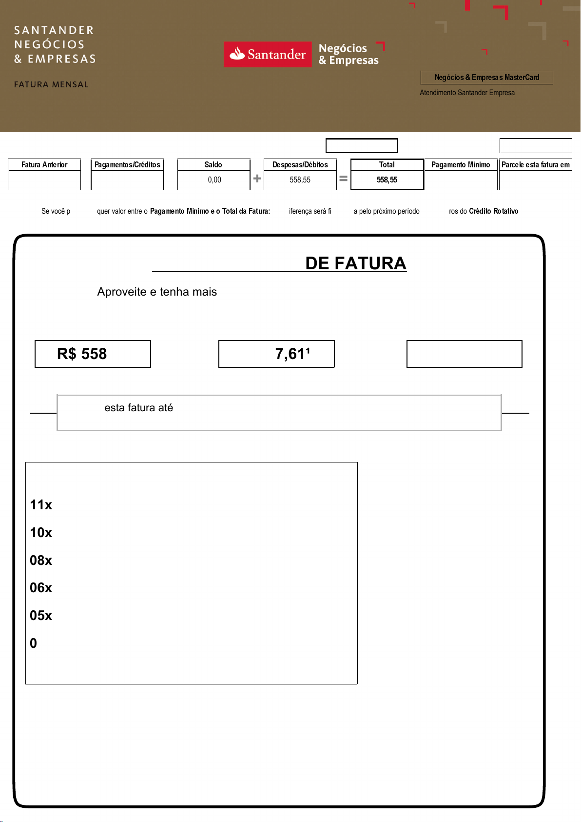 Negócios & Empresas MasterCard Atendimento Santander Empresarial Telefone Capitais: 4004-2125 Telefone Demais Regiões: 0800 726-2125 EMPRESA VALORES EM REAIS Data de Vencimento: 30/01/2024 Data do Fechamento da Fatura: 17/01/2024 FADIA GHANEM 06100108755 5526 XXXX XXXX 1406 - Parcele esta fatura em 12 X 77,61 Pagamento Mínimo 55,85 Fatura Anterior 328,72 - Pagamentos/Créditos 328,72 = Saldo 0,00 + Despesas/Débitos 558,55 = Total 558,55 Se você pagar qualquer valor entre o Pagamento Mínimo e o Total da Fatura: esta diferença será financiada pelo próximo período com os juros do Crédito Rotativo e IOF. 11x 10x 08x 06x 05x 04x R$ 77,61¹R$ 558,55 R$ 77,61¹11 x+ PARCELAMENTO DE FATURA Aproveite e tenha mais flexibilidade para pagar a fatura do seu cartão. Parcele esta fatura até: 30/jan/24 com taxa de juros de 10,59% ao mês (234,64% ao ano) com valor total de R$ 931,32 Valor desta fatura Pague a 1ª Parcela de: Parcelas Mensais Fixas O Parcelamento de Fatura inclui apenas o valor total desta fatura no momento da contratação, sem considerar as novas compras e compras parceladas a vencer nos próximos meses. 1.O Custo Efetivo Total (CET) é de 251,27% ao ano, com valor total a pagar de R$ 931,32, sendo a contratação R$ 558,55 (59,98% do total devido), com IOF de R$ 6,37 (0,68% do total devido) e juros de R$ 366,40 (39,34% do valor total devido). Para saber o CET das demais opções de parcelamento disponíveis, acesse o aplicativo (Santander Empresas), consulte nossos gerentes ou a Central de Atendimento Santander. A efetivação do seu parcelamento de fatura poderá levar até 5 dias após o pagamento da 1ª parcela do plano escolhido. Caso o pagamento da 1ª parcela não seja realizado até a data de vencimento desta fatura, serão cobrados encargos de mora sobre o saldo devedor, podendo ocorrer o bloqueio do cartão até a identificação do pagamento. Para contratar, acesse o App Santander Empresas, Internet Banking ou Caixas Eletrônicos e efetue um único pagamento do valor exato da 1ª parcela do plano escolhido até o dia 30/jan/24. Se preferir, leve esta fatura a uma lotérica ou agência bancária e realize o pagamento utilizando o código de barras. As parcelas aqui apresentadas não incluem a opção do Seguro Prestamista. Veja outras opções: CET (% a.a.) 251,40% 251,41% 252,18% 253,52% 254,84% 257,50% Total a pagar R$ 892,98 R$ 855,30 R$ 783,04 R$ 714,60 R$ 681,75 R$ 650,16 Parcelas R$ 81,18 R$ 85,53 R$ 97,88 R$ 119,10 R$ 136,35 R$ 162,54 O custo efetivo Total (CET) máximo é de 257,50% ao ano, com valor total a pagar de R$ 650,16, sendo a contratação de R$ 558,55 (85,91% do total devido), com IOF de R$ 3,16 (0,49% do total devido) e juros de R$ 88,45 (13,60% do total devido). 1/2 Negócios & Empresas MasterCard Atendimento Santander Empresarial Telefone Capitais: 4004-2125 Telefone Demais Regiões: 0800 726-2125 EMPRESA VALORES EM REAIS Data de Vencimento: 30/01/2024 Data do Fechamento da Fatura: 17/01/2024 FADIA GHANEM 06100108755 5526 XXXX XXXX 1406 - Parcele esta fatura em 12 X 77,61 Pagamento Mínimo 55,85 Fatura Anterior 328,72 - Pagamentos/Créditos 328,72 = Saldo 0,00 + Despesas/Débitos 558,55 = Total 558,55 Se você pagar qualquer valor entre o Pagamento Mínimo e o Total da Fatura: esta diferença será financiada pelo próximo período com os juros do Crédito Rotativo e IOF. Demonstrativo das Transações Pgtos e Créditos Débitos e Despesas Total dos Créditos em R$ em US$ em R$ Pagamentos 328,72 Créditos Variação cambial Outros Total dos Débitos em R$ em US$ em R$ Total de compras em R$ 540,05 Total de compras em US$ Saques Encargos Multas Variação cambial (cotação do dólar: R$ 5,1977) Anuidade Diferenciada 18,50 Tarifa Retirada - País Tarifa Retirada - Exterior Outros Encargos Taxas para o próximo período: Crédito Rotativo a.m. 13,35% Saques a.m. 13,35% Compras Parceladas c/ juros a.m. 4,99% Parcelamento de Fatura a.m. 10,59% Total Parcelado a.m. 5,79% Parcelamento automático 10,59% Pagamento Mínimo: Pagando apenas o valor mímino desta fatura até a data de vencimento, os encargos a serem pagos na próxima fatura serão de: R$ 71,90 Data prevista para o fechamento da próxima fatura: 19/02/2024 Esfera Período de aquisição de 01/12/2023 a 31/12/2023 Este é o saldo de pontos de todos os seus cartões que participam do Esfera. Saldo Anterior 3.856 (+) Bônus Ganhos por Compras 48 (=) Saldo Atual: 3.697 Pontos a expirar em 01/01/0001: 141 Pontos a expirar em 01/01/0001: 318 Saiba mais em www.bonusesfera.com.br. Mensagens Importantes A PARTIR DE AGORA VOCE RECEBERA A FATURA DA SUA EMPRESA VIA EMAIL E PELO APP SANTANDER EMPRESAS. O SANTANDER AGRADECE SUA COLABORACAO COM O MEIO AMBIENTE. Outros Serviços Parcele o total desta fatura em: 11 X 81,18 10 X 85,53 08 X 97,88 06 X 119,10 05 X 136,35 04 X 162,54 12 X 77,61 PARA CONTRATAR O PARCELAMENTO DE FATURA: Faça um único pagamento do valor da parcela escolhida até o vencimento desta fatura. O valor da parcela já inclui IOF e taxa de juros. Cartões em atraso devem consultar a Central de Atendimento Santander antes da contratação. 033-7 03399.49281 36982.014007.02884 901022 4 00000000000000 Agência Recebedora Pagável preferencialmente no banco Santander Vencimento 30/01/2024 Beneficiário Banco Santander (Brasil) S.A. - CNPJ: 90.400.888/0001-42 Av. Presidente Juscelino Kubitschek, 2041 e 2235 Bloco A - Vila Olímpia - São Paulo - SP - cep 04543-011 Agência/Cód. Beneficiário 050 04 92836 9 Data Documento 17/01/2024 Número Referência 1391660000656550 Espécie FT-CI Aceite N Data Process 17/01/2024 Nosso Número 8201400028849 Uso Banco CENTRAL Carteira COB Espécie R$ Quantidade Valor Valor do documento Instruções PREENCHER O VALOR A SER PAGO NO CAMPO FATURAS PAGAS APOS O VENCIMENTO TERÃO ACRESCIMO E ENCARGOS, CALCULADOS A PARTIR DA DATA DO VENCIMENTO E INCLUIDOS NA SUA PROXIMA FATURA MENSAL. APOS 19/02/2024, PAGAR SOMENTE NAS AGENCIAS DO SANTANDER. 1391660000656550 