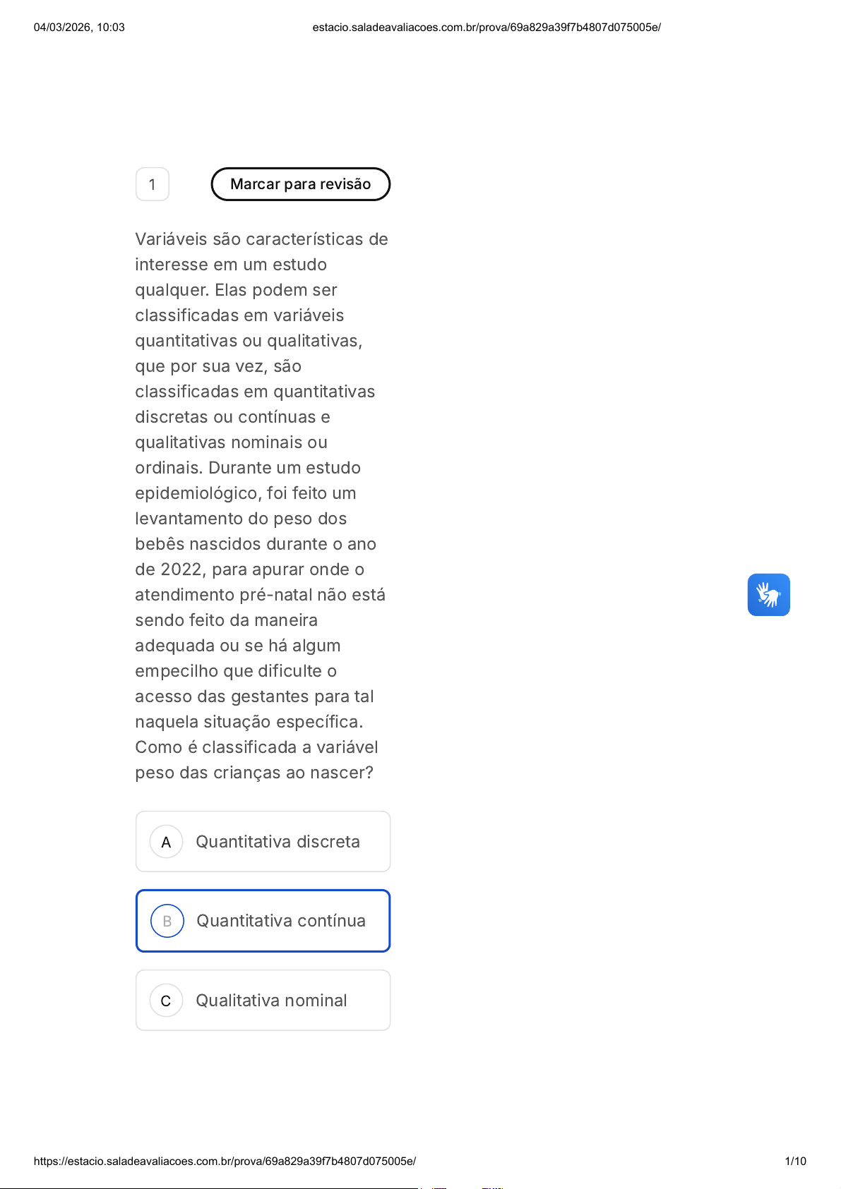 A B C 1 Marcar para revisão Variáveis são características de interesse em um estudo qualquer. Elas podem ser classificadas em variáveis quantitativas ou qualitativas, que por sua vez, são classificadas em quantitativas discretas ou contínuas e qualitativas nominais ou ordinais. Durante um estudo epidemiológico, foi feito um levantamento do peso dos bebês nascidos durante o ano de 2022, para apurar onde o atendimento pré-natal não está sendo feito da maneira adequada ou se há algum empecilho que dificulte o acesso das gestantes para tal naquela situação específica. Como é classificada a variável peso das crianças ao nascer? Quantitativa discreta Quantitativa contínua Qualitativa nominal 04/03/2026, 10:03 estacio.saladeavaliacoes.com.br/prova/69a829a39f7b4807d075005e/ https://estacio.saladeavaliacoes.com.br/prova/69a829a39f7b4807d075005e/ 1/10 D E A B C D E Qualitativa ordinal Qualitativa contínua 2 Marcar para revisão (SEFAZ/AP / 2010 - adaptada) Os dados a seguir são as quantidades de empregados de cinco pequenas empresas: 6, 5, 8, 5, 6. A Considerando que as empresas representam nossa população, a variância da quantidade de empregados dessas cinco empresas é igual a: 0,8 1,2 1,6 2,0 2,4 3 Marcar para revisão 04/03/2026, 10:03 estacio.saladeavaliacoes.com.br/prova/69a829a39f7b4807d075005e/ https://estacio.saladeavaliacoes.com.br/prova/69a829a39f7b4807d075005e/ 2/10 A B C D E Maria, aluna de educação física, está estudando alguns marcadores bioquímicos para correlacionar a performance de jogadores de futebol do seu time com esses marcadores. Durante sua análise, ela fez o levantamento de todas as idades dos jogadores do seu time, e teve a seguinte série de dados: 14, 14, 16, 16, 16, 16, 17, 17, 17, 18, 19, 25, 16, 19, 30, 31, 32, 32, 33, 35, 36, 37, 39, 39, 40, 41. Qual a amplitude que Maria encontrou? 23 25 26 41 27 4 Marcar para revisão Na análise da quantidade de suor de jogadores de vôlei, por quantidades de pulos dados durante determinado jogo, foi calculado, considerando todos os jogadores, um coeficiente 04/03/2026, 10:03 estacio.saladeavaliacoes.com.br/prova/69a829a39f7b4807d075005e/ https://estacio.saladeavaliacoes.com.br/prova/69a829a39f7b4807d075005e/ 3/10 A B C D E de Spearman igual a 0,6. Esse resultado indica que: Os pulos dos jogadores são uma variável indireta para a quantidade de suor dos jogadores. Os pulos dos jogadores são uma variável direta para a quantidade de suor dos jogadores. Os pulos dos jogadores são a única variável que interfere na quantidade de suor dos jogadores. Os pulos dos jogadores não interferem na quantidade de suor dos jogadores. Os pulos dos jogadores são a única variável que interfere indiretamente na quantidade de suor dos jogadores. 5 Marcar para revisão 04/03/2026, 10:03 estacio.saladeavaliacoes.com.br/prova/69a829a39f7b4807d075005e/ https://estacio.saladeavaliacoes.com.br/prova/69a829a39f7b4807d075005e/ 4/10 A B C D E Uma pessoa em um exame de vista, apresentou ter 74% de sua visão. Se o esperado é que ele tenha 100% de sua visão, a distância existente entre o dado observado e o dado esperado é igual a: 0,12 0,10 0,15 0,20 0,26 6 Marcar para revisão "É um conjunto de conceitos, métodos e formas de ação prática que se aplicam ao conhecimento e transformação do processo saúde-doença na dimensão coletiva ou social". Essa interpretação corresponde ao propósito da: 04/03/2026, 10:03 estacio.saladeavaliacoes.com.br/prova/69a829a39f7b4807d075005e/ https://estacio.saladeavaliacoes.com.br/prova/69a829a39f7b4807d075005e/ 5/10 A B C D E Epidemiologia experimental. Epidemiologia analítica. Epidemiologia social. Epidemiologia descritiva. Epidemiologia teórica. 7 Marcar para revisão (adaptada CESPE / CEBRASPE - 2021 - SEDUC-AL - Professor - Matemática) Considere que, em uma turma de matemática, o professor tenha distribuído as notas da primeira avaliação dos alunos conforme a tabela apresentada a seguir: É correto afirmar que a média das notas dessa turma na primeira avaliação foi superior há: 04/03/2026, 10:03 estacio.saladeavaliacoes.com.br/prova/69a829a39f7b4807d075005e/ https://estacio.saladeavaliacoes.com.br/prova/69a829a39f7b4807d075005e/ 6/10 A B C D E 5 4 3 2 1 8 Marcar para revisão Ao organizar dados experimentais, é comum representá-los graficamente por histogramas. Porém, para estimar probabilidades com maior precisão, é necessário um modelo teórico. Com base nos conceitos de distribuição normal e na representação gráfica dos dados, assinale a alternativa que identifica corretamente o recurso utilizado para determinar a probabilidade de ocorrência de um valor. 04/03/2026, 10:03 estacio.saladeavaliacoes.com.br/prova/69a829a39f7b4807d075005e/ https://estacio.saladeavaliacoes.com.br/prova/69a829a39f7b4807d075005e/ 7/10 A B C D E A probabilidade de ocorrência é identificada diretamente a partir do eixo vertical do histograma. O histograma fornece a função densidade usada para cálculo da probabilidade exata de um valor. A área sob as barras do histograma indica a distribuição acumulada dos dados observados. A distribuição de Gauss, usada para calcular probabilidades, é obtida da frequência acumulada dos dados. A determinação da probabilidade é feita com base em uma curva gaussiana, chamada distribuição normal. 9 Marcar para revisão 04/03/2026, 10:03 estacio.saladeavaliacoes.com.br/prova/69a829a39f7b4807d075005e/ https://estacio.saladeavaliacoes.com.br/prova/69a829a39f7b4807d075005e/ 8/10 A B C D E (CONSULPLAN/FSERJ- 2020/Adaptado) Em uma área com 100 mil habitantes, foram notificados cerca de 50 casos de sarampo nos últimos dois meses. Com essas informações, os serviços de saúde podem construir indicadores a respeito desse agravo. Considerando tais informações, assinale o indicador de saúde que poderá ser elaborado com os dados descritos. Taxa de epidemia. Coeficiente de incidência. Coeficiente de prevalência. Coeficiente de mo