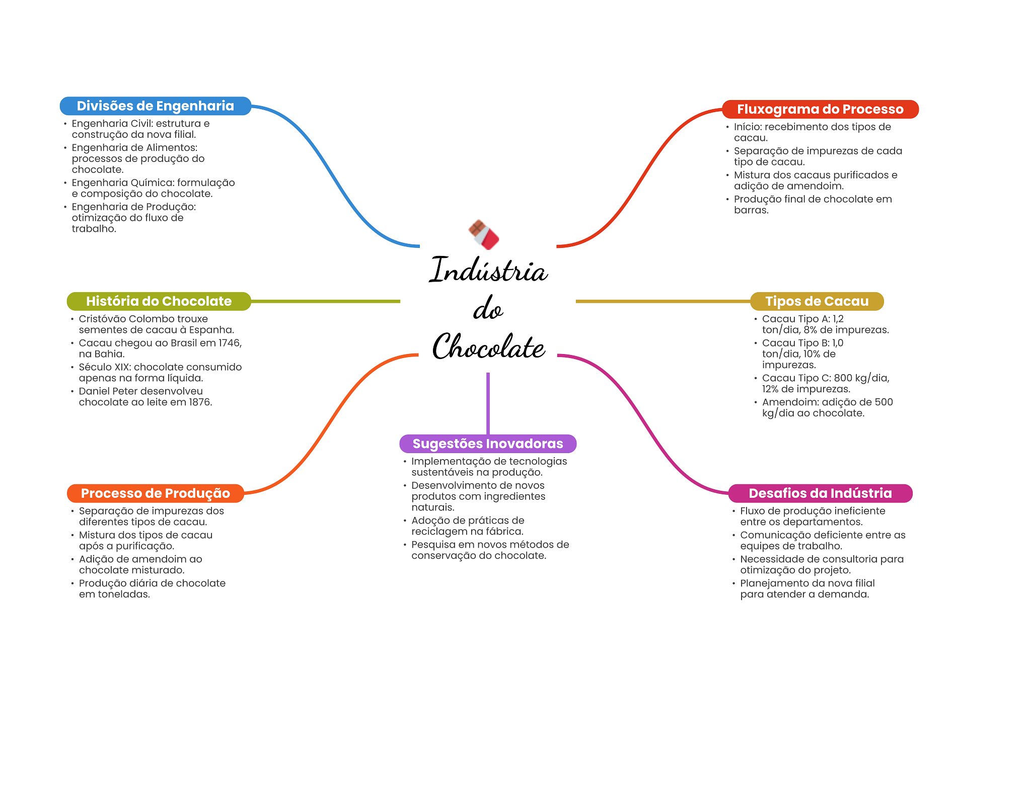 Divisões de Engenharia Fluxograma do Processo Engenharia Civil: estrutura e Início: recebimento dos tipos de construção da nova filial. cacau. Engenharia de Alimentos: Separação de impurezas de cada processos de produção do tipo de cacau. chocolate. Mistura dos cacaus purificados e Engenharia Química: formulação adição de amendoim. e composição do chocolate. Produção final de chocolate em Engenharia de Produção: barras. otimização do fluxo de trabalho. Indústria História do Chocolate do Tipos de Cacau Cristóvão Colombo trouxe Cacau Tipo A: 1,2 sementes de cacau à Espanha. ton/dia, 8% de impurezas. Cacau chegou ao Brasil em 1746, Chocolate Cacau Tipo B: 1,0 na Bahia. ton/dia, 10% de Século XIX: chocolate consumido impurezas. apenas na forma líquida. Cacau Tipo C: 800 kg/dia, Daniel Peter desenvolveu 12% de impurezas. chocolate ao leite em 1876. Amendoim: adição de 500 kg/dia ao chocolate. Sugestões Inovadoras Implementação de tecnologias sustentáveis na produção. de novos Processo de Produção produtos com ingredientes Desafios da Indústria Separação de impurezas dos naturais. Fluxo de produção ineficiente diferentes tipos de cacau. Adoção de práticas de entre departamentos. Mistura dos tipos de cacau reciclagem na fábrica. Comunicação deficiente entre as após a purificação. Pesquisa em novos métodos de equipes de trabalho. Adição de amendoim ao conservação do chocolate. Necessidade de consultoria para chocolate misturado. otimização do projeto. Produção diária de chocolate Planejamento da nova filial em toneladas. para atender a demanda.