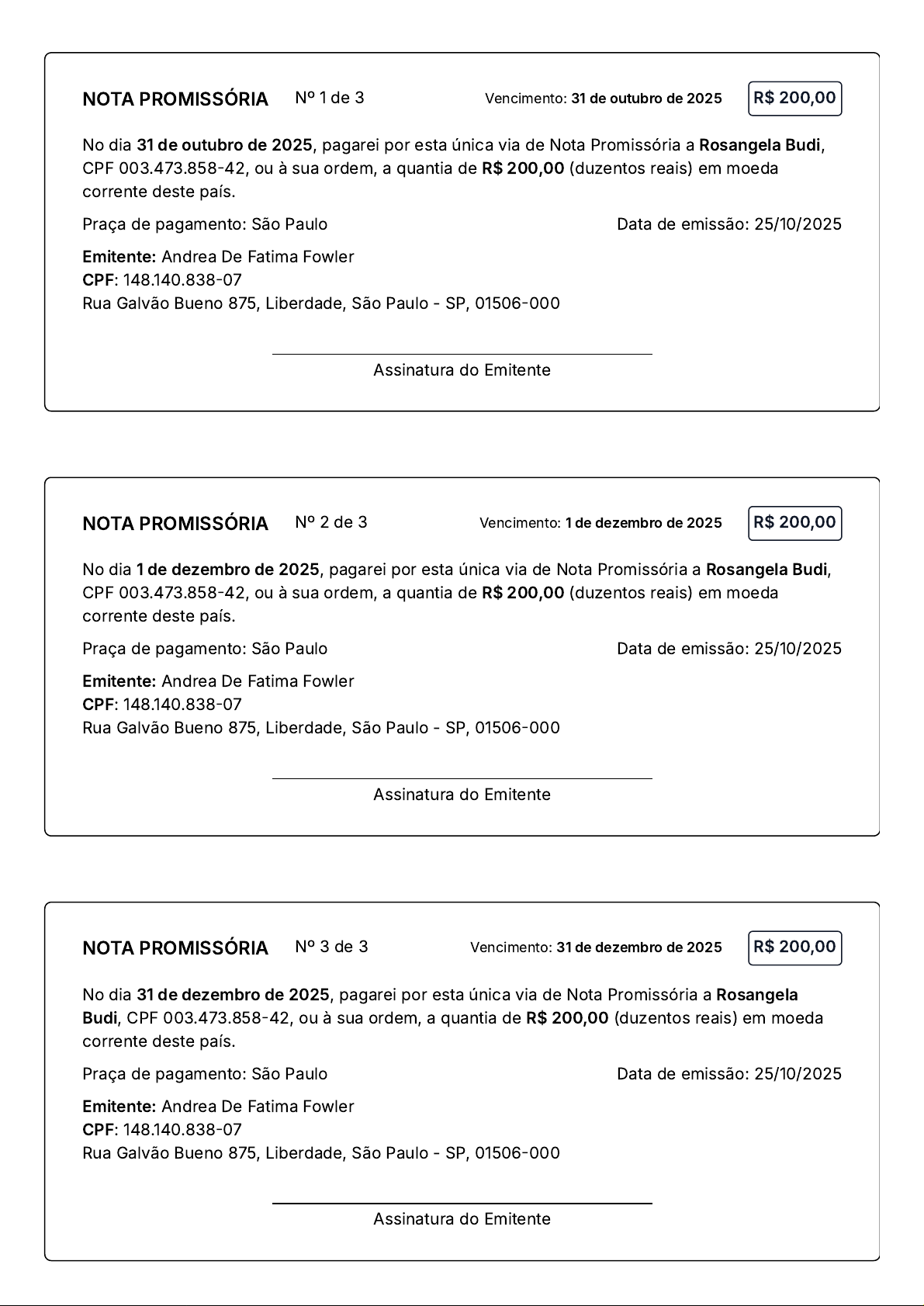 NOTA PROMISSÓRIA Nº 1 de 3 Vencimento: 31 de outubro de 2025 R$ 200,00 No dia 31 de outubro de 2025, pagarei por esta única via de Nota Promissória a Rosangela Budi, CPF 003.473.858-42, ou à sua ordem, a quantia de R$ 200,00 (duzentos reais) em moeda corrente deste país. Praça de pagamento: São Paulo Data de emissão: 25/10/2025 Emitente: Andrea De Fatima Fowler CPF: 148.140.838-07 Rua Galvão Bueno 875, Liberdade, São Paulo - SP, 01506-000 Assinatura do Emitente NOTA PROMISSÓRIA Nº 2 de 3 Vencimento: 1 de dezembro de 2025 R$ 200,00 No dia 1 de dezembro de 2025, pagarei por esta única via de Nota Promissória a Rosangela Budi, CPF 003.473.858-42, ou à sua ordem, a quantia de R$ 200,00 (duzentos reais) em moeda corrente deste país. Praça de pagamento: São Paulo Data de emissão: 25/10/2025 Emitente: Andrea De Fatima Fowler CPF: 148.140.838-07 Rua Galvão Bueno 875, Liberdade, São Paulo - SP, 01506-000 Assinatura do Emitente NOTA PROMISSÓRIA Nº 3 de 3 Vencimento: 31 de dezembro de 2025 R$ 200,00 No dia 31 de dezembro de 2025, pagarei por esta única via de Nota Promissória a Rosangela Budi, CPF 003.473.858-42, ou à sua ordem, a quantia de R$ 200,00 (duzentos reais) em moeda corrente deste país. Praça de pagamento: São Paulo Data de emissão: 25/10/2025 Emitente: Andrea De Fatima Fowler CPF: 148.140.838-07 Rua Galvão Bueno 875, Liberdade, São Paulo - SP, 01506-000 Assinatura do Emitente