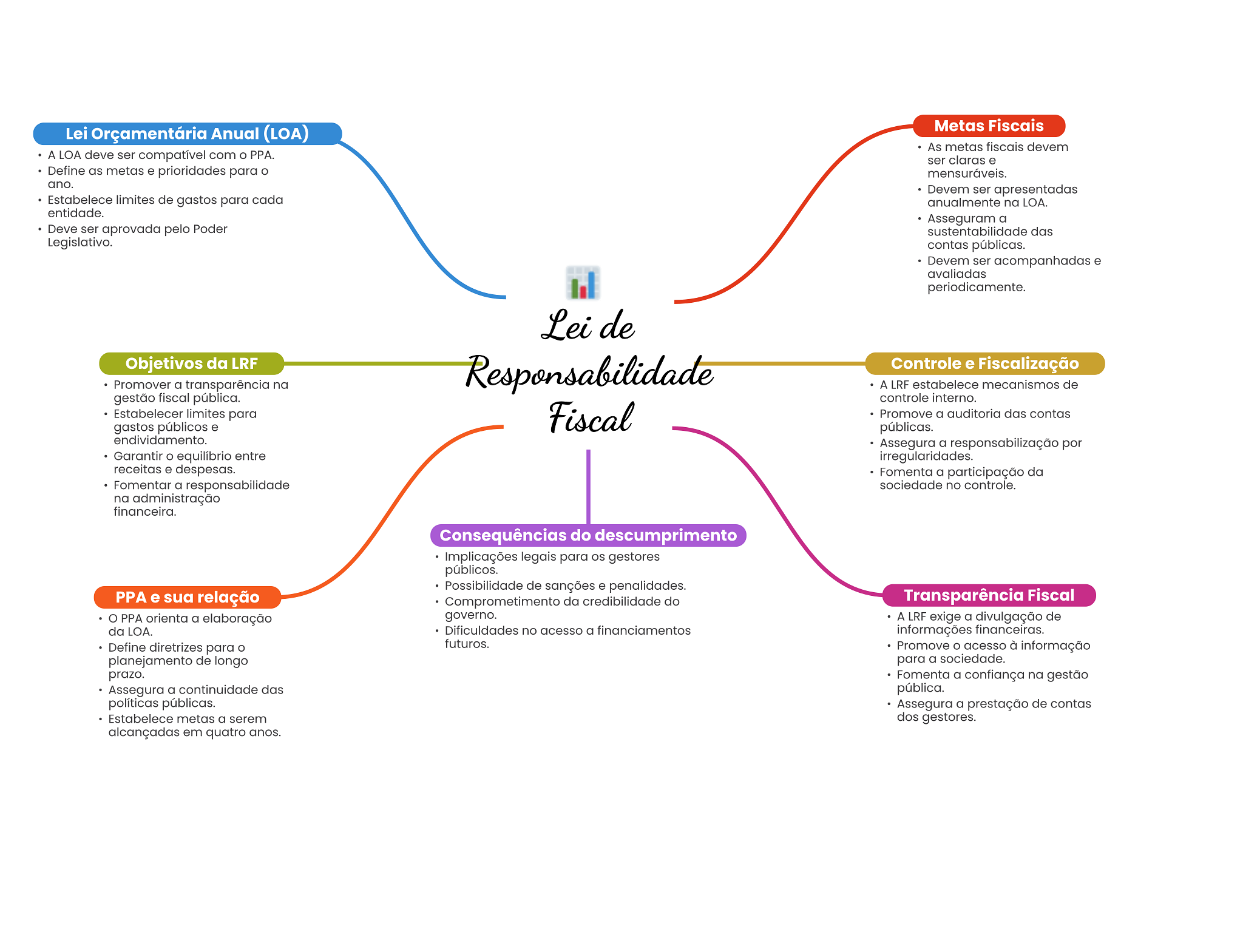 Lei Orçamentária Anual (LOA) Metas Fiscais As metas fiscais devem A LOA deve ser compatível com PPA. ser claras e Define as metas e prioridades para mensuráveis. ano. Devem ser apresentadas Estabelece limites de gastos para cada anualmente na LOA. entidade. Asseguram a Deve ser aprovada pelo Poder sustentabilidade das Legislativo. contas públicas. Devem ser acompanhadas e avaliadas periodicamente. Leide Objetivos da LRF Promover a transparência na Responsabilidade Controle e Fiscalização A LRF estabelece mecanismos de gestão fiscal pública. controle interno. Estabelecer limites para gastos públicos e Fiscal Promove a auditoria das contas públicas. endividamento. Assegura a responsabilização por Garantir equilíbrio entre irregularidades. receitas e despesas. Fomenta a participação da Fomentar a responsabilidade sociedade no controle. na administração financeira. Consequências do descumprimento Implicações legais para OS gestores públicos. Possibilidade de sanções e penalidades. PPA e sua relação Comprometimento da credibilidade do Transparência Fiscal PPA orienta a elaboração governo. A LRF exige a divulgação de da LOA. Dificuldades no acesso a financiamentos informações financeiras. Define diretrizes para futuros. Promove O acesso à informação planejamento de longo para a sociedade. prazo. Fomenta a confiança na gestão Assegura a continuidade das pública. políticas públicas. Assegura a prestação de contas Estabelece metas a serem dos gestores. alcançadas em quatro anos.