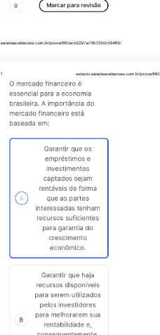 9 Marcar para revisão com mercado financeiro essencial para a economia brasileira. A importância do mercado financeiro baseada em: Garantir que os empréstimos e investimentos captados sejam de forma A que as partes interessadas tenham recursos suficientes para garantia do crescimento Garantir que haja recursos disponíveis para serem utilizados pelos investidores para melhorarem sua rentabilidade e,