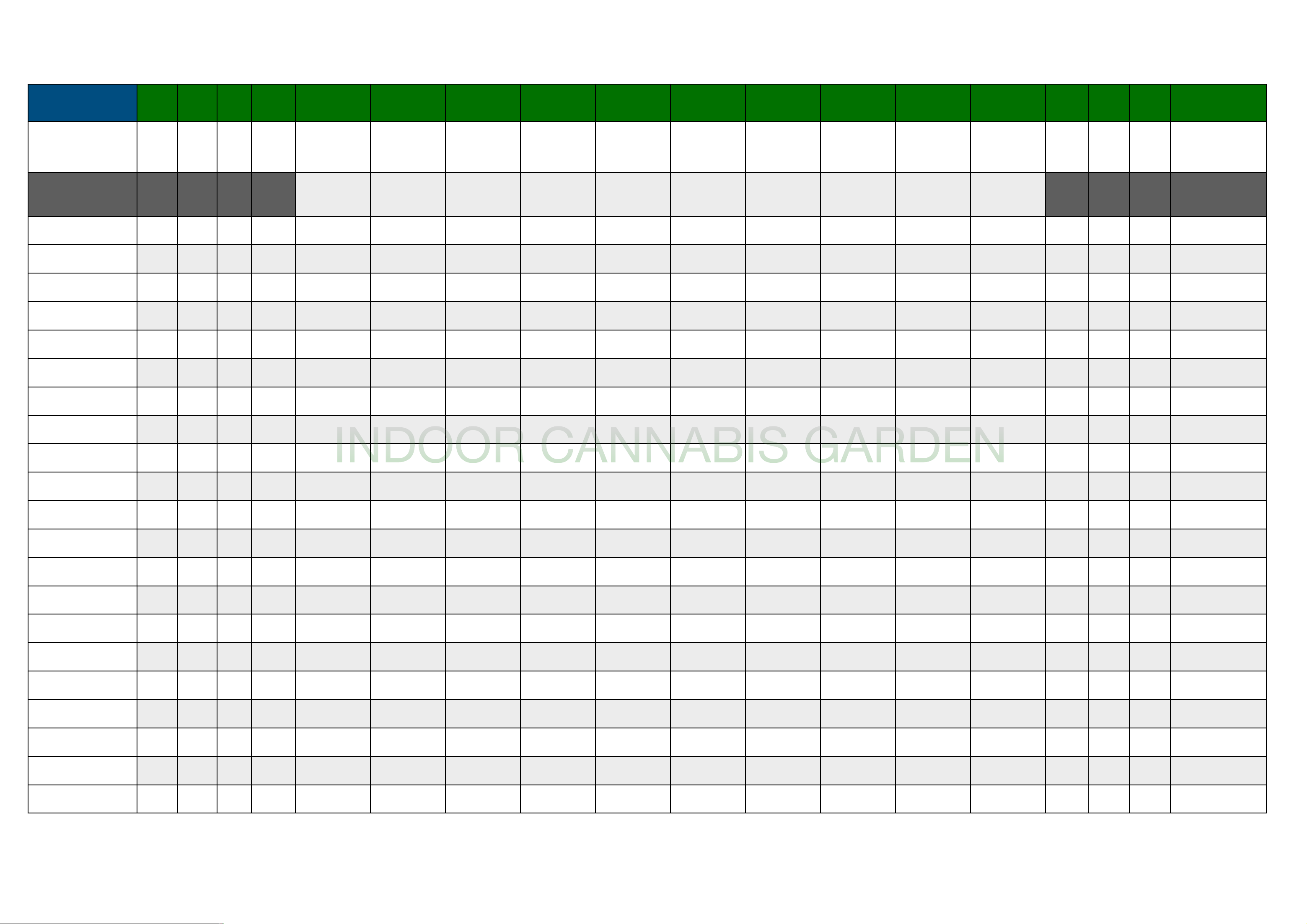 Date Or Week Light On Amount Water Amount Mixed PH Before Mix PPM Before Mix Mixture 1 Mixture 2 Mixture 3 Mixture 4 Mixture 5 Mixture 6 Mixture 7 Mixture 8 Mixture 9 Mixture 10 PH UP/DOWN Amount PH Final Result PPM Final Result Notes Example: Date = 01/27/2020 Week = Week 8 Veg 18 Hours or 12 Hours Liter(L) or _______ (PH) (PPM) Parts Per Million Measured in Milliliter (ML) or __________ Measured in Milliliter (ML) or __________ Measured in Milliliter (ML) or __________ Measured in Milliliter (ML) or __________ Measured in Milliliter (ML) or __________ Measured in Milliliter (ML) or __________ Measured in Milliliter (ML) or __________ Measured in Milliliter (ML) or __________ Measured in Milliliter (ML) or __________ Measured in Milliliter (ML) or __________ (ML) or _______ (PH) (PPM) Grow A Grow B B1 Uptake Zyme Silica Ryzo Dr Repair Week 1 18 15L 8.6 402 16ml 16ml 16ml 8ml 16ml 8ml 8ml 8ml 22ml 5.5 998 1st Week of Veg Week 2 18 15L 8.6 305 22ml 22ml 22ml 12ml 22ml 12ml 10ml 10ml 20ml 5.6 980 Week 3 18 15L 8.2 360 22ml 22ml 22ml 12ml 22ml 12ml 10ml 10ml 20ml 5.8 963 Week 4 18 15L 8.2 413 22ml 22ml 22ml 12ml 22ml 12ml 10ml 10ml 21ml 5.7 1062 Last Week of Veg Bloom A Bloom B B1 Uptake Zyme Silica Suga Rush Dr Repair Swell Potash Week 1 12 15L 8.3 604 30ml 30ml 22ml 12ml 22ml 12ml 12ml 12ml 20ml 21ml 5.9 1204 1st Week of Flower Week 2 12 15L 8.6 347 30ml 30ml 22ml 12ml 22ml 12ml 12ml 12ml 20ml 24m l 5.8 1104 Week 3 12 15L 8.7 317 30ml 30ml 22ml 12ml 22ml 12ml 12ml 12ml 20ml 25ml 5.7 1151 Week 4 12 15L 8.3 421 30ml 30ml 22ml 12ml 22ml 12ml 12ml 12ml 20ml 24m l 5.9 1090 Plants Look Great Week 5 12 15L 7.5 490 30ml 30ml 22ml 12ml 22ml 12ml 12ml 12ml 22ml 20ml 5.9 1193 Week 6 12 15L 7.9 495 30ml 30ml 22ml 12ml 22ml 12ml 12ml 12ml 22ml 20ml 5.9 1405 Signs of Nutrient Burn Week 7 12 15L 8.1 557 30ml 30ml 22ml 12ml 22ml 12ml 12ml 12ml 22ml 19ml 6.0 1380 Week 8 12 15L 8.0 715 30ml 30ml 22ml 12ml 22ml 12ml 12ml 12ml 22ml 20ml 6.0 1489 Last Week of Flower INDOOR CANNABIS GARDEN Example Strain: Critical by Royal Queen Seeds Plant Count: Four Plants Ver 1.0 Page # 1 / 1 Indoor Cannabis Garden