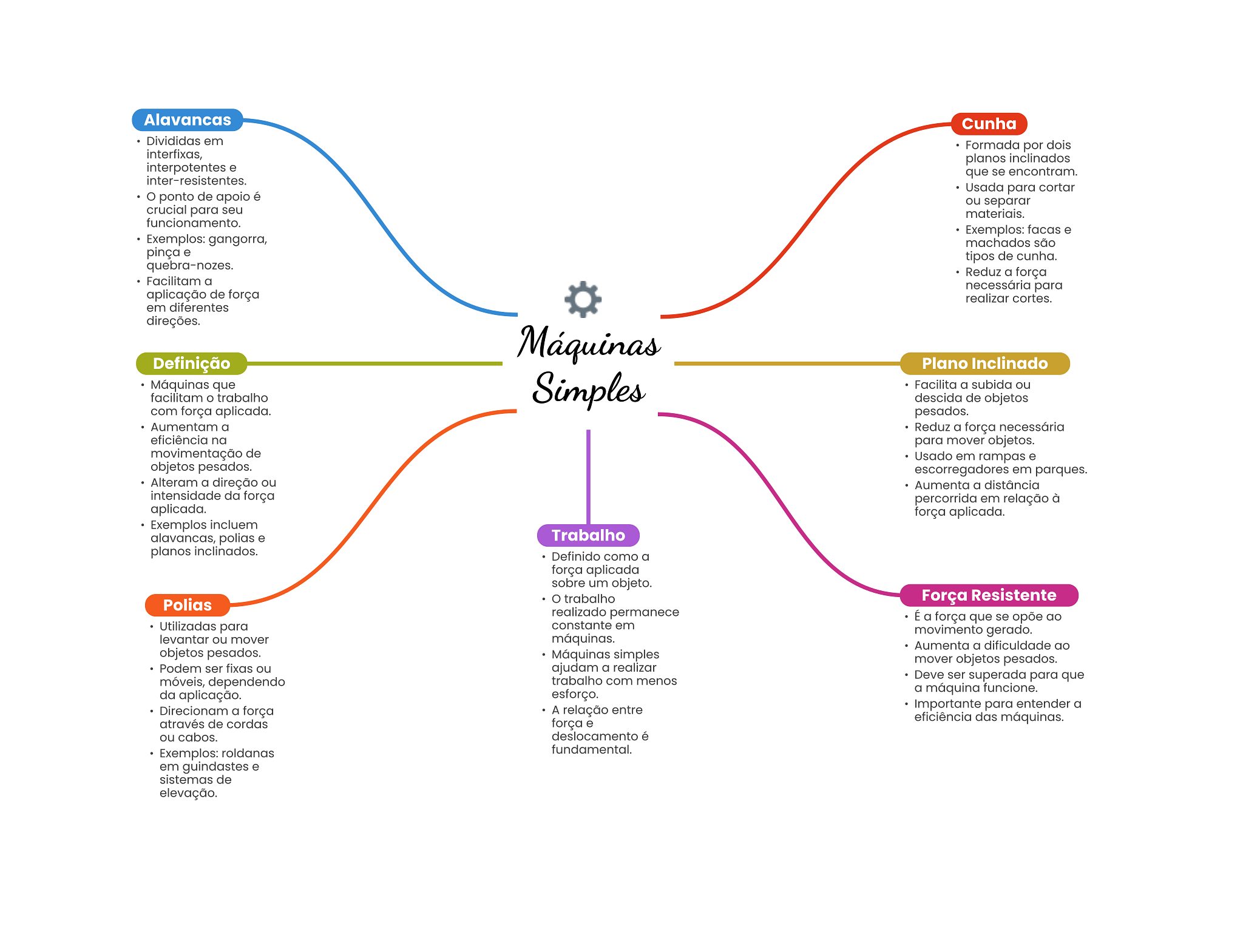 Alavancas Cunha Divididas em Formada por dois interfixas, planos inclinados interpotentes e que se encontram. inter-resistentes. Usada para cortar ponto de apoio é ou separar crucial para seu materiais. funcionamento. Exemplos: facas e Exemplos: gangorra, machados são pinça e tipos de cunha. quebra-nozes. Reduz a força Facilitam a necessária para aplicação de força realizar cortes. em diferentes direções. Máquinas Definição Plano Inclinado Máquinas que facilitam trabalho Simples Facilita a subida ou descida de objetos com força aplicada. pesados. Aumentam a Reduz a força necessária eficiência na para mover objetos. movimentação de Usado em rampas e objetos pesados. escorregadores em parques. Alteram a direção ou Aumenta a distância intensidade da força percorrida em relação à aplicada. força aplicada. Exemplos incluem alavancas, polias e Trabalho planos inclinados. Definido como a força aplicada sobre um objeto. Polias trabalho Força Resistente realizado permanece É a força que se opõe ao Utilizadas para constante em movimento gerado. levantar ou mover máquinas. Aumenta a dificuldade ao objetos pesados. Máquinas simples mover objetos pesados. Podem ser fixas ou ajudam a realizar móveis, dependendo trabalho com menos Deve ser superada para que da aplicação. esforço. a máquina funcione. Direcionam a força A relação entre Importante para entender a através de cordas força e eficiência das máquinas. ou cabos. deslocamento é Exemplos: roldanas fundamental. em guindastes e sistemas de elevação.