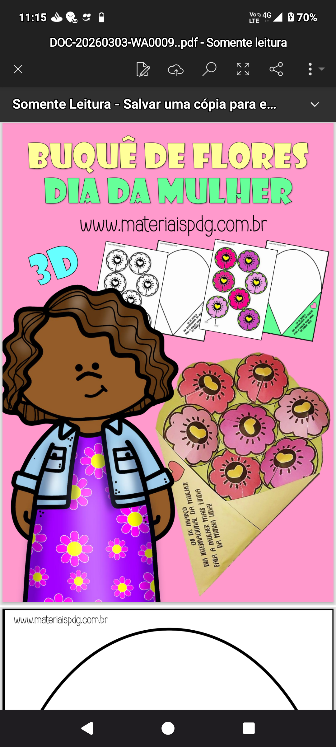 11:15 4G LTE ++ 70% - Somente leitura X Somente Leitura - Salvar uma cópia para DIA DA MULHER www.materiaispdg.com.br DIA 08 DE INTERNACIONAL MAIS DA LINDA MULHER PARA A MULHER VIDA! DA www.materiaispdg.com.br