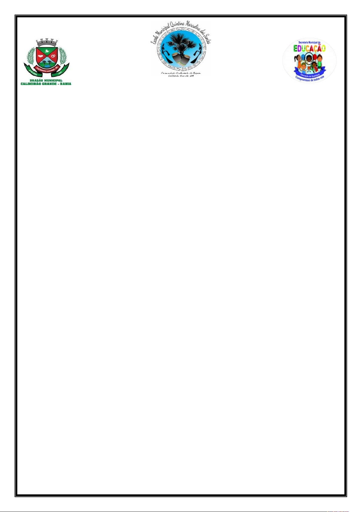 PREFEITURA MUNICIPAL DE CALDEIRÃO GRANDE - PMCG SECRETARIA MUNICIPAL DA EDUCAÇAO E CULTURA - SEMEC AV. HÉLIO CORREIA, CENTRO, Nº 12, CEP: 44750-000 CNPJ: 13.913.355/0001-13 Escola Municipal Quintina Marculina dos Estados Professora: Cristiana Silva de Carvalho Coordenadora: Lucila Santana Área do conhecimento: Geografia Período 06/03 a 16/06/2023 A Força da Educação: Você sonha Deus realiza. 1ª Unidade: Objetivo geral: Identificar a existência de diferentes lugares formados por diferentes culturas, sabendo respeitar as diferenças e a importância da relação homem-meio para a manutenção de um cultura e sociedade. Habilidades: Reconhecer a complexidade da formação cultural brasileira e sua importância na formação de um sentimento coletivo de identidade. Analisar os mecanismos e as dinâmicas de comércio de escravizados em suas diferentes fases identificando os agentes responsáveis pelo tráfico e as regiões e zonas africanas de procedência dos escravizados. Identificar as motivações dos processos migratórios em diferentes tempos e espaços e avaliar o papel desempenhado pela migração nas regiões de destino. Objeto do conhecimento: A formação da população brasileira. Os povos indígenas e os colonizadores. O tráfico de africanos escravizados para Brasil A chegada de imigrantes. Procedimento metodológicos: Aula explicativas, expositiva e dialogada, aparelho de projeção, materiais impressos, dicionário, caneta, lápis, caderno e livro didático. Avaliação: Participação e comportamento Trabalho em grupo e individual Pesquisa Avaliação escrita. PREFEITURA MUNICIPAL DE CALDEIRÃO GRANDE - PMCG SECRETARIA MUNICIPAL DA EDUCAÇAO E CULTURA - SEMEC AV. HÉLIO CORREIA, CENTRO, Nº 12, CEP: 44750-000 CNPJ: 13.913.355/0001-13 Escola Municipal Quintina Marculina dos Santos Professora: Cristiana Silva de Carvalho Coordenadora: Lucila Santana Área do conhecimento: História Período 06/03 a 16/06/2023 A Força da Educação: Você sonha Deus realiza. 1ª Unidade: Objetivo geral: Proporcionar o estudo das teorias acerca do surgimento e do desenvolvimento da humanidade e suas relações com o meio ambiente durante o período conhecido como pré-história. Habilidades: Reconhecer a história como resultado da ação do ser humano no tempo e no espaço, com base na identificação de mudanças e permanência ao longo do tempo. Destacar a importância da música como documento histórico. Refletir sobre destinos períodos da pré-história e suas características. Conceituar que a agricultura é o meio pelo qual a humanidade produz os alimentos e as matérias-primas para a fabricação de diversos objetos. Objeto do conhecimento: Os primeiros grupos humanos O estado da história O tempo na história A vida pré-história A agricultura e a ocupação do espaço Procedimento metodológicos: Aula explicativas, expositiva e dialogada, roda de conversar, pesquisa, materiais impressos, livro didático, caneta, lápis, caderno e aparelho de projeção. Avaliação: Participação e comportamento Trabalho em grupo e individual Pesquisa Avaliação escrita. image1.jpeg image2.png image3.jpeg