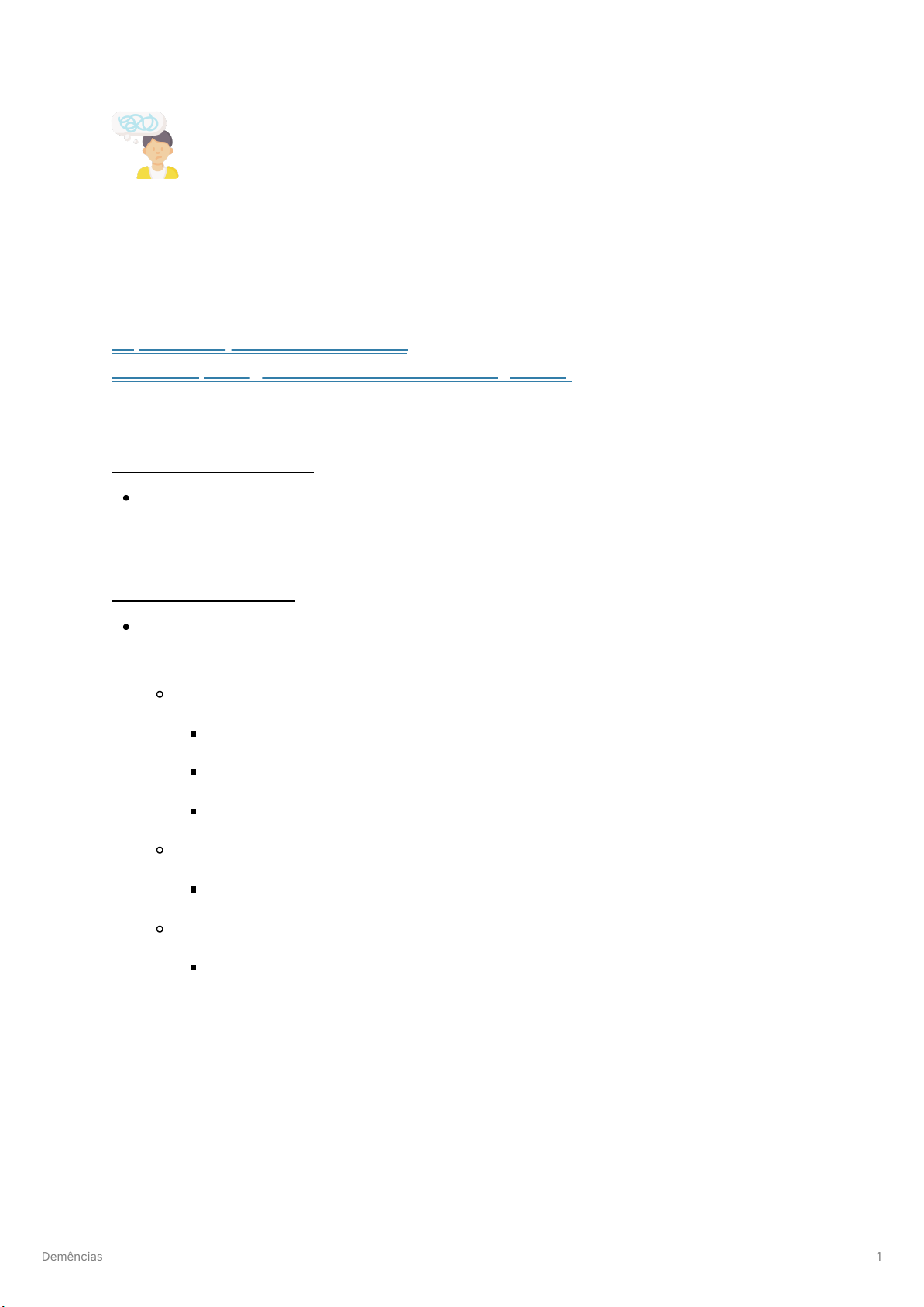 Demências 1 Demências https://www.youtube.com/watch? v=wbE5MpkdAtg&t=2s&ab_channel=EstratégiaMED > EPIDEMIOLOGIA 65 anos - dobra a cada 5a > DIAGNÓSTICO queixa cognitiva em pelo menos 2 domínios (visuoespacial, memória, executiva, linguagem, personalidade) perda objetiva MEEM 28 pontos Montreal Cognitive Assessment MoCA neuropsicológico perda de funcionalidade trabalhar ou executar tarefas da rotina não explicado por doença psiquiátrica depressão - déficit atencional https://www.youtube.com/watch?v=wbE5MpkdAtg&t=2s&ab_channel=Estrat%C3%A9giaMED https://www.youtube.com/watch?v=wbE5MpkdAtg&t=2s&ab_channel=Estrat%C3%A9giaMED Demências 2 > RASTREAMENTO DE CAUSAS REVERSÍVEIS medicamentos: BDZ, antagonista colinérgico e agonista dopaminérgico neurolépticos e tricíclicos insuficiência renal e hepática neurossífilis e HIV neoplasia, caquexia hematoma subdural crônico e HPN anemia hipo/hipertireoidismo e distúrbios do Ca depressão B1, B12 e ácido fólico tiamina - encefalopatia de Wernicke-Korsakoff WKS oftalmoplegia ataxia confusão mental Demências 3 NÃO precisa de EEG e líquor vascular: doença de pequenos vasos múltiplos infartos RM micro-infartos Demências 4 ALZHEIMER atrofia hipocampo > déficit de memória imagem normal no início - altera tardiamente curso lento déficit acetilcolina LCR ↑ TAU e ↓ proteína amiloide depósito da proteína beta-amiloide no neurônio TTO sintomático aumentar acetilcolina - anticolinesterásico antagonista do receptor de glutamato NMDA Demências 5 > VASCULAR causas AVC “estratégicoˮ acomete área da cognição instalação aguda doença de pequenos vasos Biswanger) curso lento associação com parkinsonismo de MMII imagem alterada desde o início períodos de “agudizaçãoˮ inicialmente acomete função executiva - sequenciar tarefas > HIDROCEFALIA DE PRESSÃO NORMAL tríade de Hakim-Adams Demências 6 imagem: aumento da proporção do ventrículo índice de Evans 0,3 hidrocefalia NÃO-hipertensiva déficit na reabsorção do líquor Tap Test TTO DVP > FRONTO-TEMPORAL (DFT) mais frequente em 65a imagem: atrofia dos lobos alteração de personalidade variantes: comportamental afasia progressiva > CORPÚSCULOS DE LEWY parkinsonismo + alucinação visual + flutuação da cognição parkinsonismo 1 ano evolui para alt. cognição hipersensível à neurolépticos (risperidona, quetiapina) aumenta a rigidez > RAPIDAMENTE PROGRESSIVA 1a de evolução Demências 7 várias doenças - principal: Doença de Creutzfeldt-Jakob DCJ príon - partícula infectante “doença da vaca loucaˮ ataxia e epilepsia grave líquor: proteína 1433 RM restrição à difusão alteração de sinal no tálamo e núcleos da base > ANOTAÇÕES DE AULA TIPO ALZHEIMER formas iniciais: benefício maior do tratamento degenerativa: morte de grupo de células que exercem função específica esclerose múltipla: oligodendrócito astrócito: pericapilar - “barreiraˮ hipocampo: células granulares atrofia via sistema límbico: emoção via piramidal: motor proteína TAU enovelado neurofibrilar associação com doença vascular cerebral de pequenos vasos espaço de Virchow-Robin virtual biswanger - associação com DM > FISIOPATOLOGIA Demências 8 diminuição da beta-amiloide no líquor e deposição nos vasos proteína TAU fosforilada FORMA LÍMBICA APOE4 genética proteína TAU diminuída - amilodopatia forma amnéstica: esquecimento início tardio FORMA POSTERIOR confunde com DCV alteração de praxia: execução de tarefas - função motora que já foi aprendido comprometimento visuo-espacial FORMA TEMPORAL E múltiplos domínios: nomeação início precoce taupatia evolução rápida apresentação assimétrica: à esquerda perde linguagem: fluência FORMA MLT SPARING APOE4 início em jovens perde a capacidade antecipatória Demências 9 preserva parte mesial do lobo temporal > MEMÓRIA semântica: fatos não ligados a um evento, período ou lugar preservado no envelhecimento e afecções neurológicas episódica: experiências associadas a período e local específicos sequência temporal dos eventos prejudicada: “paciente fala sobre ontem mas não sabe se o ontem foi há 1 dia ou 1 anoˮ não declarativa: “hábitoˮ “não lembramos quantos semáforos vermelhos teve de casa até a faculdade, mas sabemos que tem que parar nelesˮ cérebro percebe movimento e emoção memória curto e longo prazo “não existeˮ > PREVENÇÃO exercício físico de longa data hipoacusia - auditiva novas aprendizagens > TRATAMENTO FORMA CLÁSSICA galantamina, rivastigmina: não melhora, mas se retirar piora > anticolinesterásico memantina: não piora se suspender, pouca melhora (baixa evidência em forma moderada/grave) 20mg > antagonista do receptor NMDA […] zumabe Demências 10 afasia global progressiva exame neuropsicológico tremor: cerebelar ou núcleos da base - inespecífico