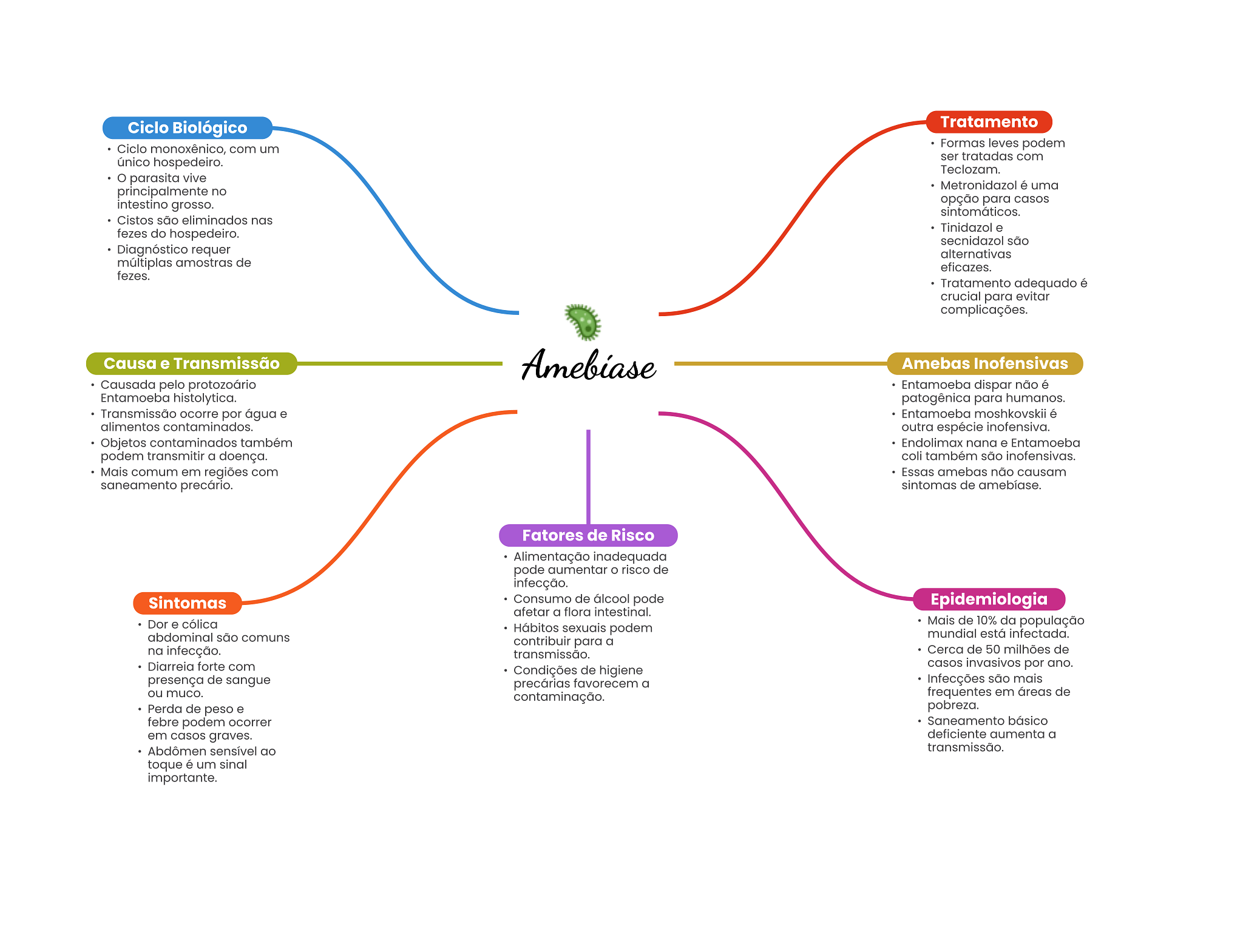 Ciclo Biológico Tratamento Ciclo monoxênico, com um Formas leves podem ser tratadas com único hospedeiro. Teclozam. parasita vive Metronidazol é uma principalmente no intestino grosso. opção para casos sintomáticos. Cistos são eliminados nas Tinidazol e fezes do hospedeiro. secnidazol são Diagnóstico requer alternativas múltiplas amostras de eficazes. fezes. Tratamento adequado é crucial para evitar complicações. Causa e Transmissão Amebiase Amebas Inofensivas Causada pelo protozoário Entamoeba dispar não é Entamoeba histolytica. patogênica para humanos. Transmissão ocorre por água e Entamoeba moshkovskii é alimentos contaminados. outra espécie inofensiva. Objetos contaminados também Endolimax nana e Entamoeba podem transmitir a doença. coli também são inofensivas. Mais comum em regiões com Essas amebas não causam saneamento precário. sintomas de amebíase. Fatores de Risco Alimentação inadequada pode aumentar risco de infecção. Sintomas Consumo de álcool pode Epidemiologia afetar a flora intestinal. Dor e cólica Mais de 10% da população Hábitos sexuais podem abdominal são comuns mundial está infectada. contribuir para a na infecção. transmissão. Cerca de 50 milhões de Diarreia forte com casos invasivos por ano. Condições de higiene presença de sangue precárias favorecem a Infecções são mais ou muco. contaminação. frequentes em áreas de Perda de peso e pobreza. febre podem ocorrer Saneamento básico em casos graves. deficiente aumenta a Abdômen sensível ao transmissão. toque é um sinal importante.