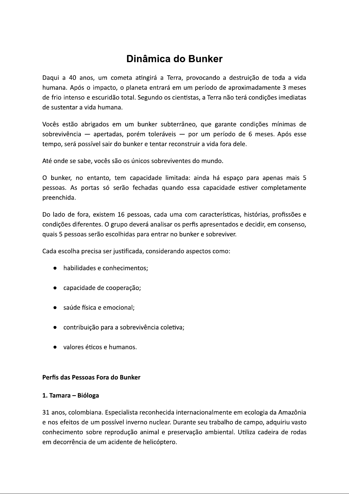 Dinâmica do Bunker Daqui a 40 anos, um cometa atingirá a Terra, provocando a destruição de toda a vida humana. Após impacto, o planeta entrará em um período de aproximadamente 3 meses de frio intenso e escuridão total. Segundo os cientistas, a Terra não terá condições imediatas de sustentar a vida humana. Vocês estão abrigados em um bunker subterrâneo, que garante condições mínimas de sobrevivência apertadas, porém toleráveis por um período de 6 meses. Após esse tempo, será possível sair do bunker e tentar reconstruir a vida fora dele. Até onde se sabe, vocês são os únicos sobreviventes do mundo. bunker, no entanto, tem capacidade limitada: ainda há espaço para apenas mais 5 pessoas. As portas só serão fechadas quando essa capacidade estiver completamente preenchida. Do lado de fora, existem 16 pessoas, cada uma com características, histórias, profissões e condições diferentes. grupo deverá analisar os perfis apresentados e decidir, em consenso, quais 5 pessoas serão escolhidas para entrar no bunker e sobreviver. Cada escolha precisa ser justificada, considerando aspectos como: habilidades e conhecimentos; capacidade de cooperação; saúde física e emocional; contribuição para a sobrevivência coletiva; valores éticos e humanos. Perfis das Pessoas Fora do Bunker 1. Tamara Bióloga 31 anos, colombiana. Especialista reconhecida em ecologia da Amazônia e nos efeitos de um possível inverno nuclear. Durante seu trabalho de campo, adquiriu vasto conhecimento sobre reprodução animal e preservação ambiental. Utiliza cadeira de rodas em decorrência de um acidente de helicóptero.2. Carlos - Médico Clínico Geral 45 anos. Possui ampla experiência em atendimento de emergência, doenças infecciosas e primeiros socorros. Trabalhou por anos em regiões com poucos recursos médicos. É casado e tem dois filhos, que não sobreviveram à catástrofe. 3. Ana Engenheira Civil 38 anos. Especialista em construção de estruturas resistentes e reaproveitamento de materiais. Tem conhecimentos básicos de hidráulica e geração alternativa de energia. Nunca trabalhou em situações extremas. 4. Roberto - Agricultor 52 anos. Trabalhou a vida inteira com agricultura familiar e cultivo de alimentos em diferentes tipos de solo. Possui conhecimentos práticos sobre plantio, colheita e criação de pequenos animais. Não tem formação acadêmica. 5. Júlia Professora 29 anos. Licenciada em Pedagogia. Tem experiência com educação infantil e alfabetização. Acredita que a reconstrução da sociedade depende da transmissão do conhecimento e da formação humana. 6. Marcos Mecânico 41 anos. Especialista em manutenção de máquinas, motores e equipamentos improvisados. Sabe consertar ferramentas com poucos recursos. Nunca trabalhou com alta tecnologia. 7. Felipe Programador 26 anos. Trabalhou com desenvolvimento de softwares e sistemas digitais. Possui grande capacidade lógica, mas pouca experiência prática fora do ambiente tecnológico. Nunca lidou com sobrevivência ou trabalho manual. 8. Helena - Enfermeira 34 anos. Atuou em hospitais públicos e campanhas humanitárias. Possui experiência em cuidados básicos de saúde, curativos e acompanhamento de pacientes. É conhecida por sua empatia e capacidade de trabalhar em equipe. 9. Eduardo - Militar40 anos. Ex-oficial do exército, com treinamento em sobrevivência, defesa e organização de grupos em situações de crise. Tem perfil autoritário e dificuldade em aceitar ordens de outras pessoas. 10. Luana Psicóloga 36 anos. Especialista em saúde mental, resolução de conflitos e trabalho em grupo. Nunca viveu situações extremas, mas acredita que o equilíbrio emocional será essencial para a sobrevivência coletiva. 11. André Químico 47 anos. Trabalhou em laboratório industrial e tem conhecimentos sobre purificação de água, produção de substâncias básicas e controle de contaminação. Não possui boa saúde física. 12. Sofia - Jovem Estudante 17 anos. Estudante do ensino médio, sem formação profissional definida. Apresenta boa saúde, curiosidade, facilidade de aprendizagem e disposição para colaborar. 13. Paulo Líder Religioso 55 anos. Atuou como líder comunitário e religioso por muitos anos. É respeitado pela capacidade de escuta, aconselhamento e mediação de conflitos. Não possui conhecimentos técnicos específicos. 14. Renata Artista 33 anos. Trabalha com música e artes visuais. Acredita que a arte é fundamental para manter a esperança, a identidade cultural e a saúde emocional em momentos de crise. 15. João Cozinheiro 48 anos. Experiência em cozinhas industriais e aproveitamento integral de alimentos. Sabe adaptar receitas com poucos recursos e manter padrões mínimos de higiene alimentar. 16. Miguel Jovem Atleta 24 anos. Excelente condição física, força e resistência. Não possui formação técnica específica, mas se dispõe a realizar trabalhos pesados e aprender novas habilidades.